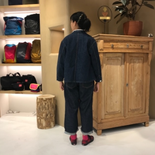 ワントーンのシンプルなスタイリングには、手元のインディアンジュエリーがアクセントです。