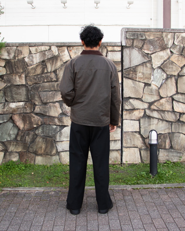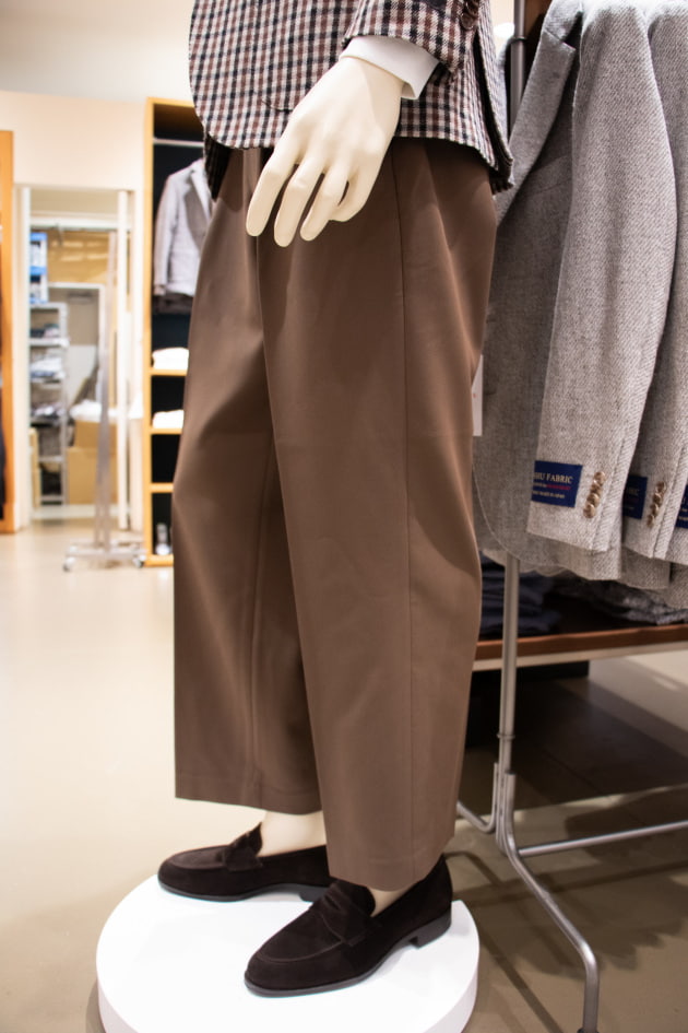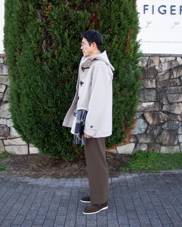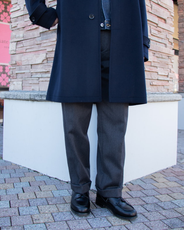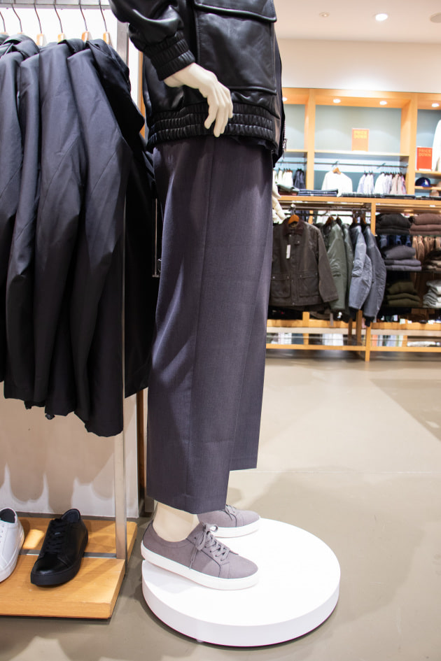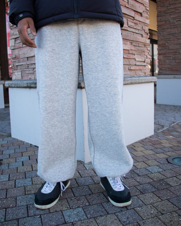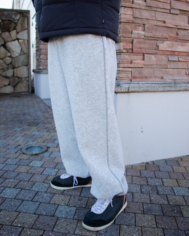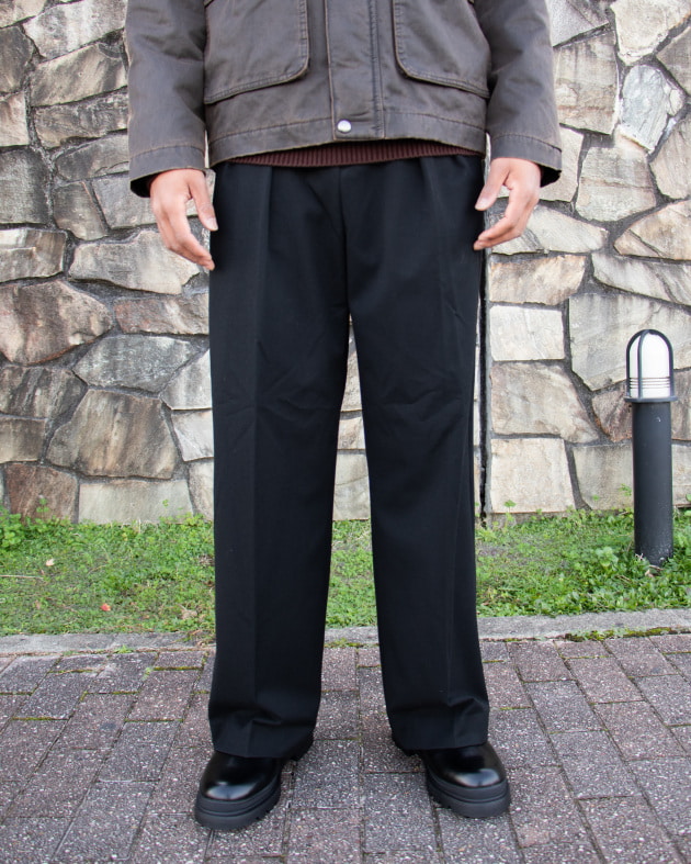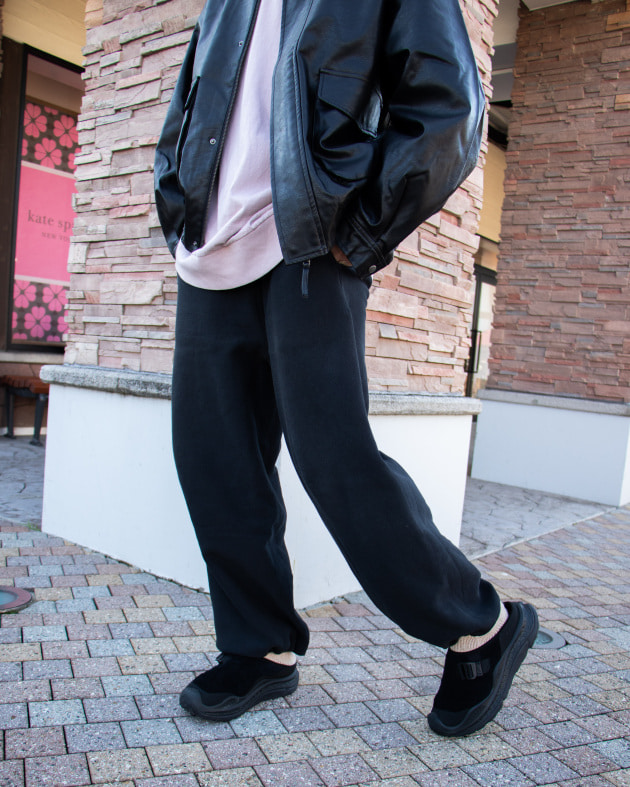 個人的にレザーや、ミリタリー由来のアイテムにはデニムやチノ、カーゴパンツ等ヘリテージなアイテムをを合わせたくなりますが、スタッフ楯はイージーパンツを合わせて軽快に合わせています。