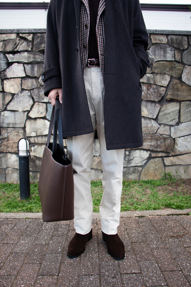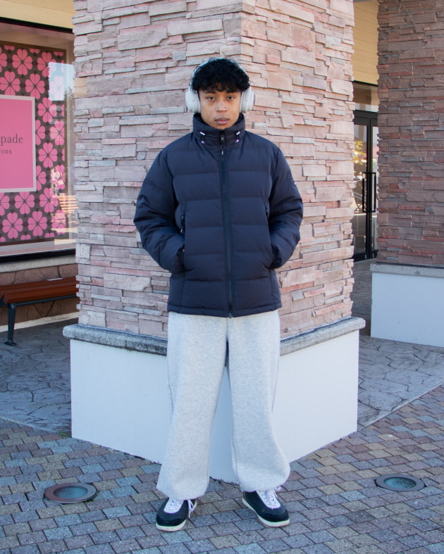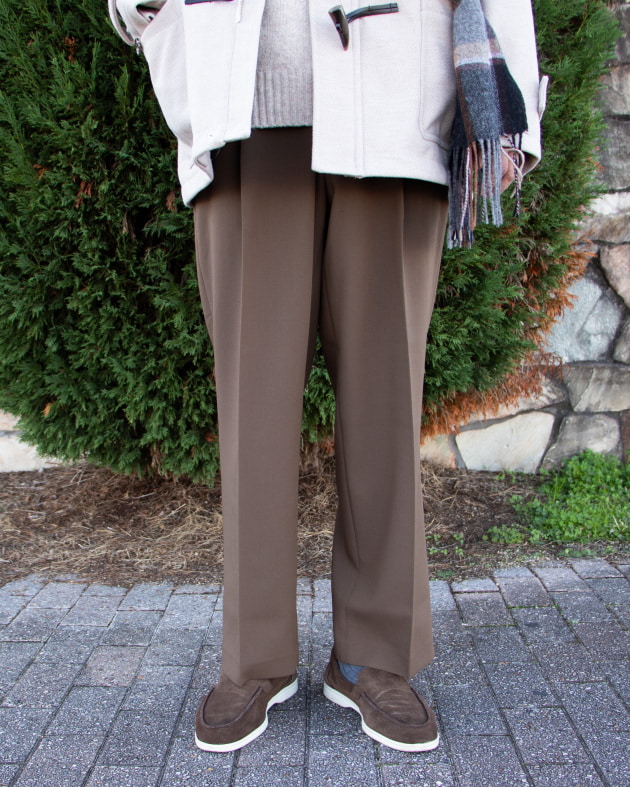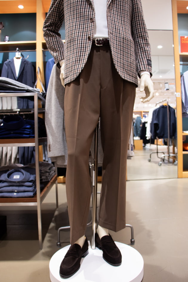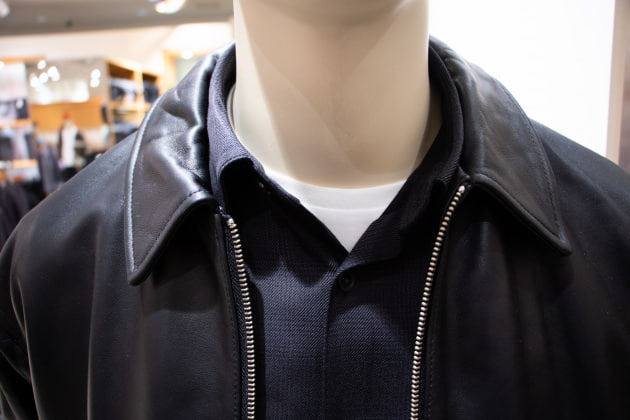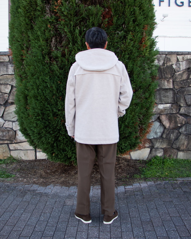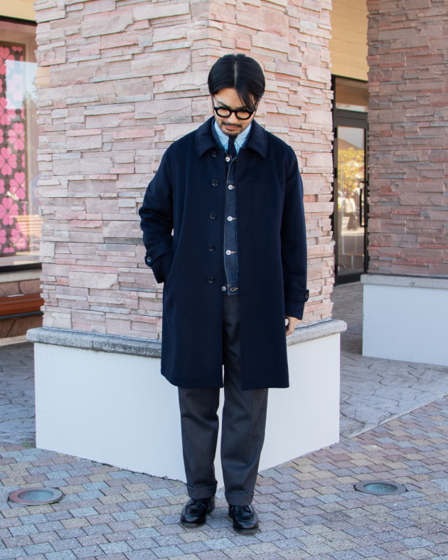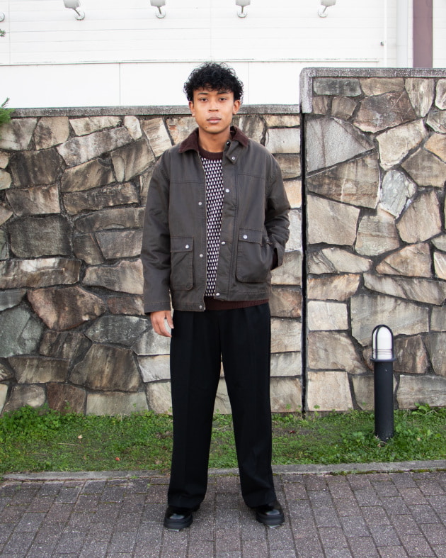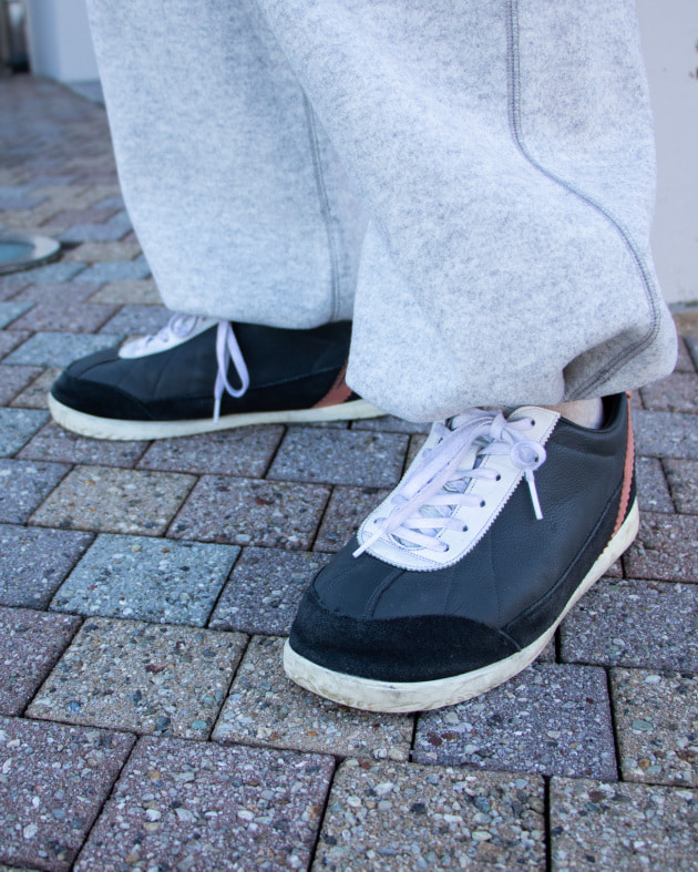 個人的にレザーや、ミリタリー由来のアイテムにはデニムやチノ、カーゴパンツ等ヘリテージなアイテムをを合わせたくなりますが、スタッフ楯はイージーパンツを合わせて軽快に合わせています。