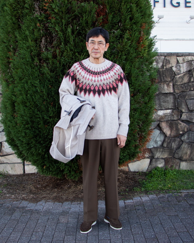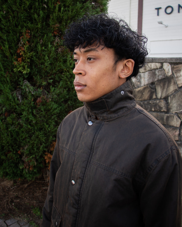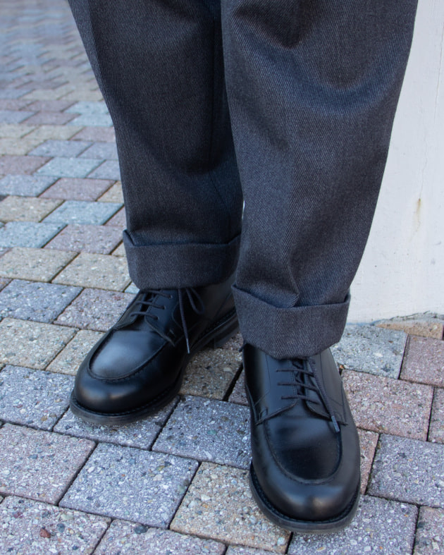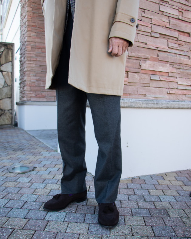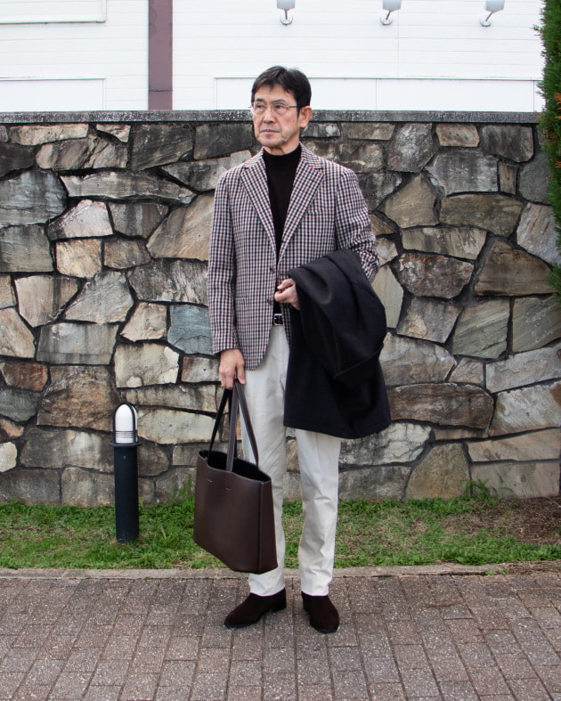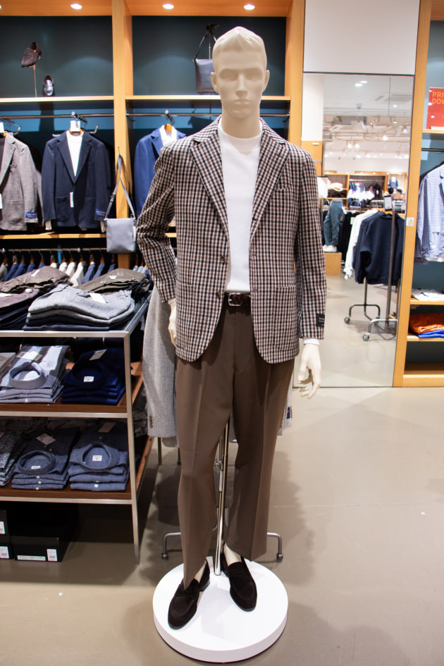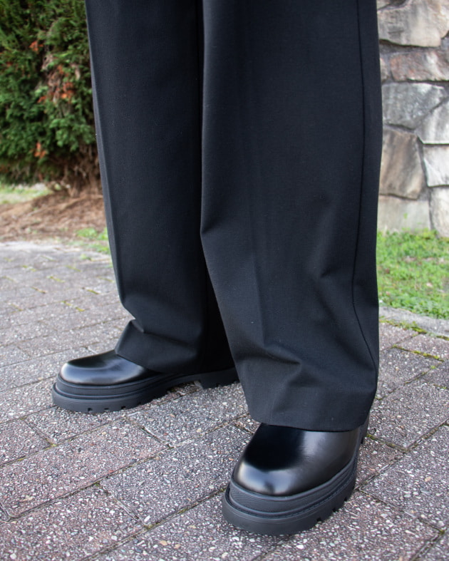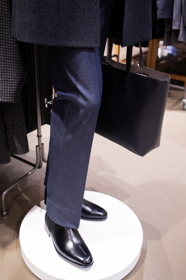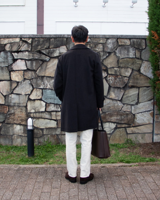 個人的にレザーや、ミリタリー由来のアイテムにはデニムやチノ、カーゴパンツ等ヘリテージなアイテムをを合わせたくなりますが、スタッフ楯はイージーパンツを合わせて軽快に合わせています。