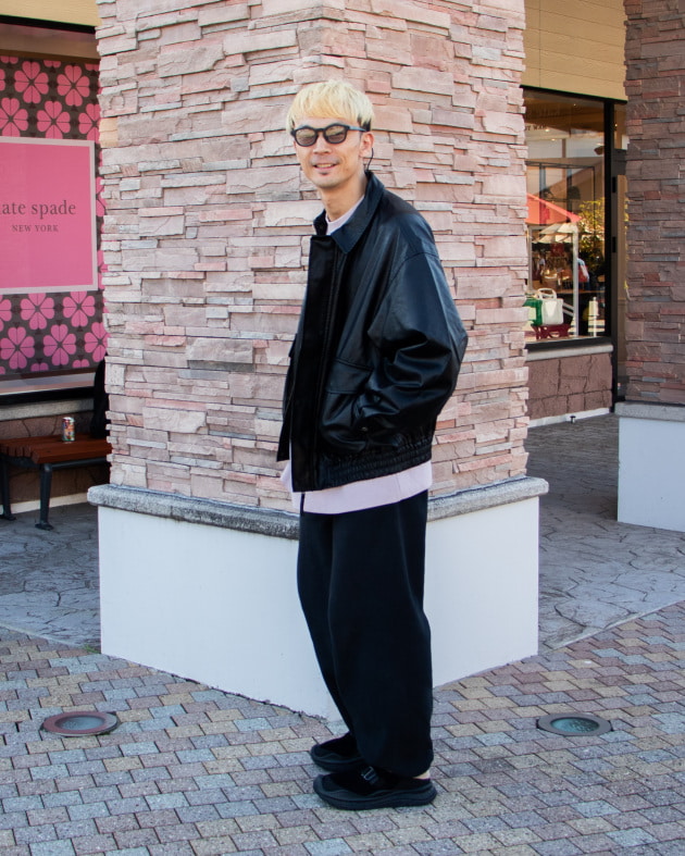 シューズもサンダルみたいなデザインを選びフェイクレザーブルゾンの重厚感を和らげています。