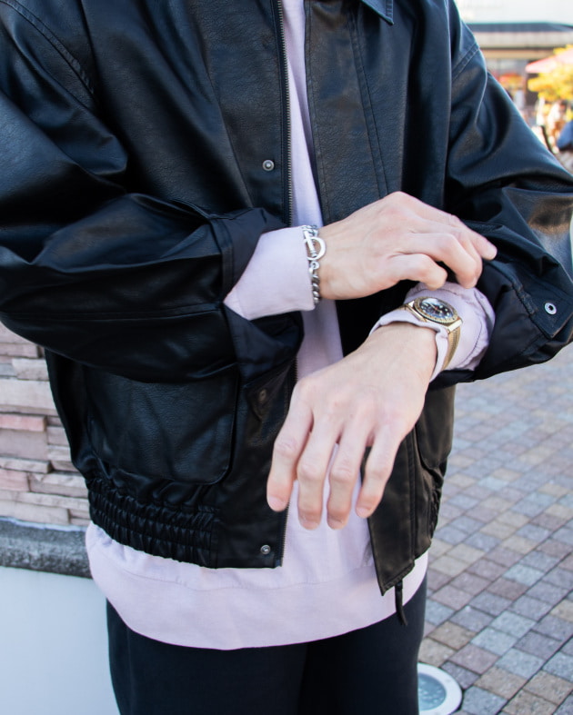 レザーと違いフェイクレザーは手入れなどが楽で扱いやすく気負いなく着られます。