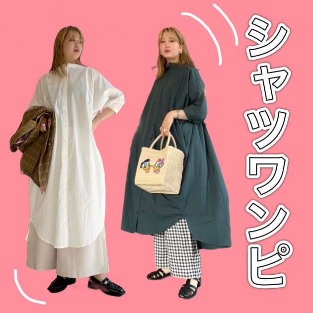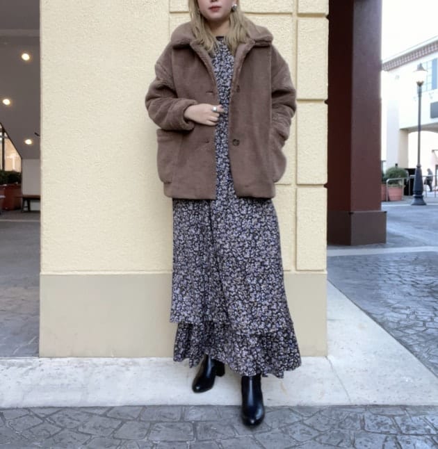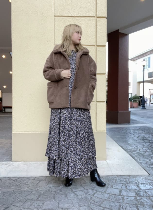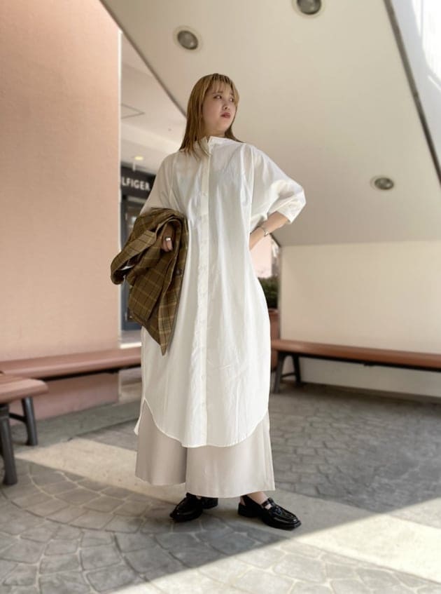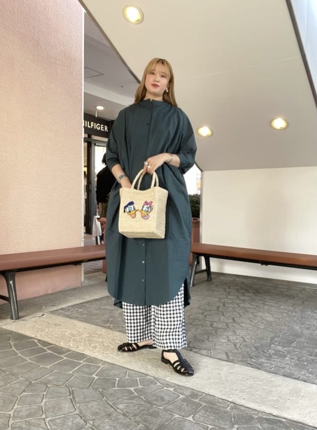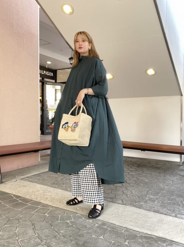 インナーにはゆるめのTシャツ。ボトムスはあえてチェック柄で柄×柄合わせに。ワンピースのカラーがブラウンなので柄×柄合わせも喧嘩せず纏まりました。