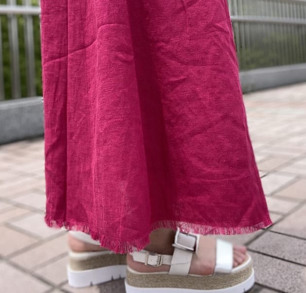 サイドにスリットが深めに入っているので、私はパンツを下に履いてスタイリングしました。柄物や色物のボトムスを履くとスタイリングに華やかにみせてくれます。