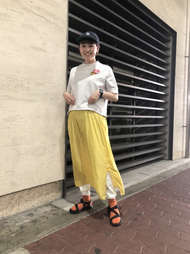 シンプルにブラウスを合わせたり、プリントTシャツにスニーカー等。