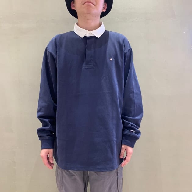 【Champion】別注のラガーシャツです!ラガーシャツでルーズシルエットのものと中々出会うことがなかったので、とても嬉しいです。ビームスとの別注での定番のチビロゴに加え、シルエット、ボタン、襟と完全別注の商品となっております。