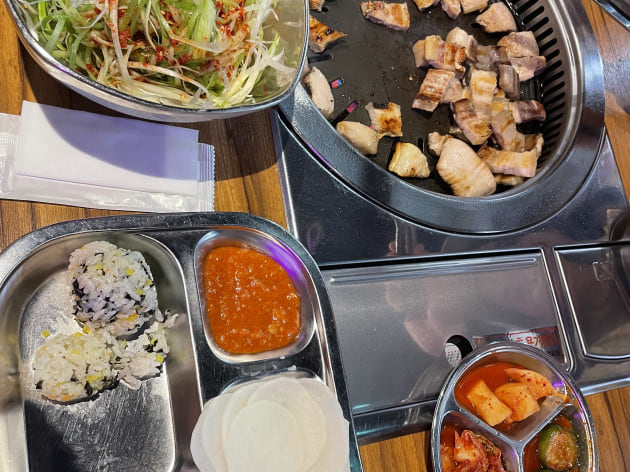 こちらはサムギョプサルと、先輩と後輩に握ってもらった混ぜご飯おにぎりです。(笑)