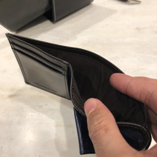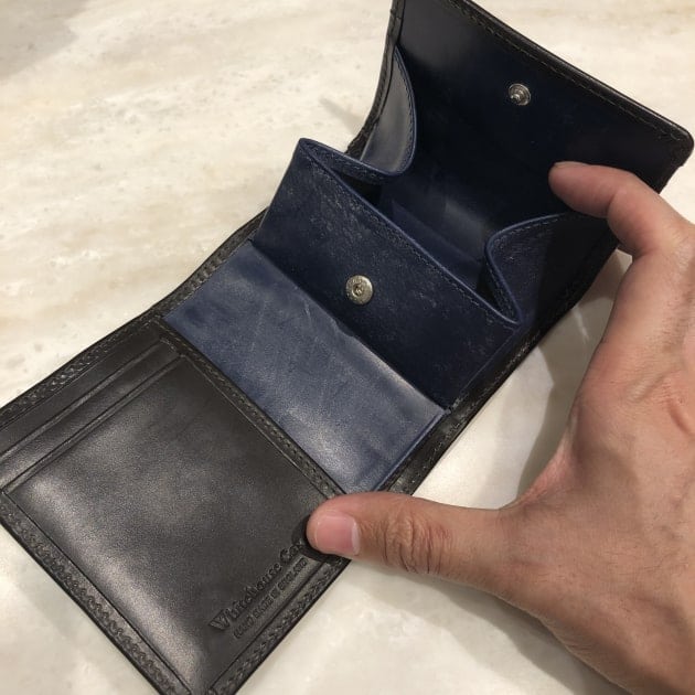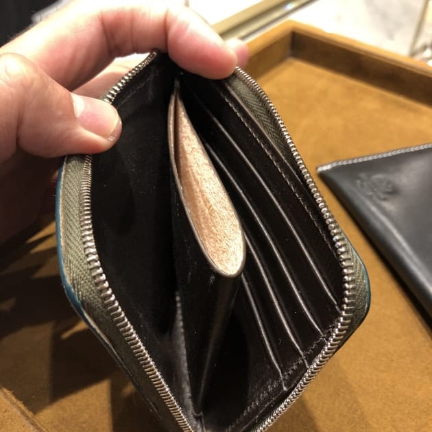 真ん中に小銭入れ、サイドはカード入れと、お札はひと折りして入れる仕様。