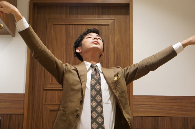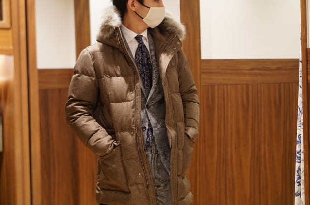 シャドウに入るヘリンボーンのスリーピース。生地に表情が出て、非常に洒落て見えるんです。
