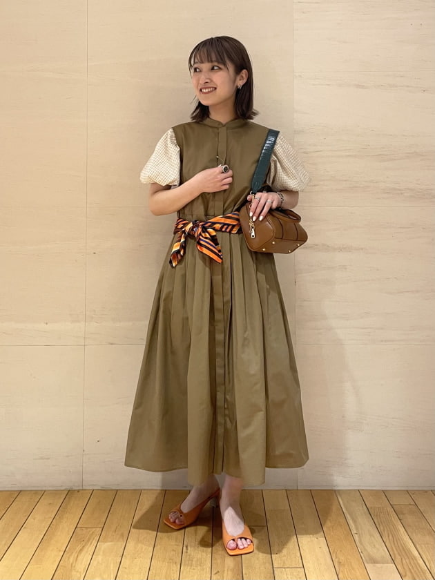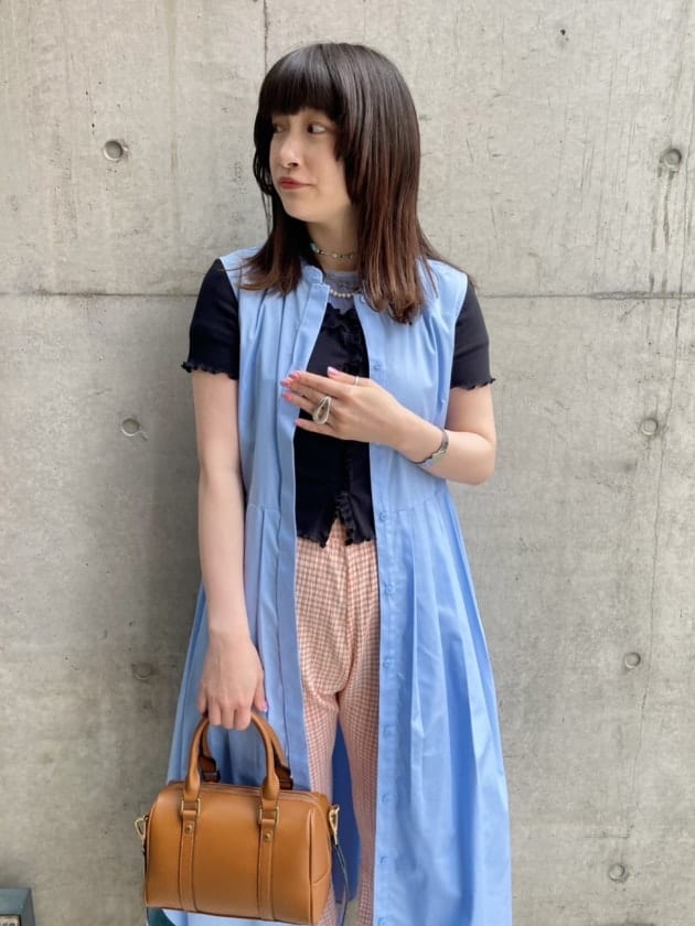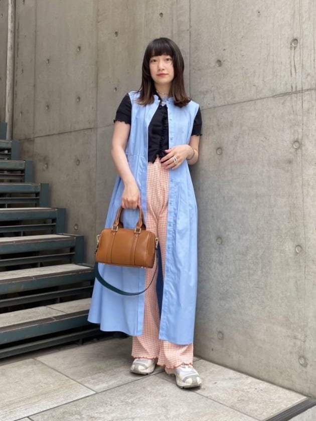 発色のいいブルーのワンピースにブラウンのバックを合わせてます◎