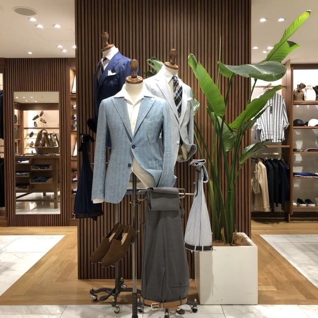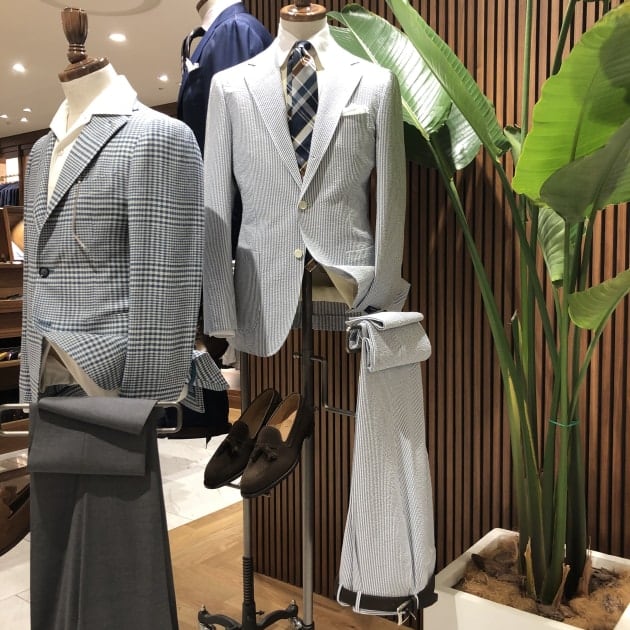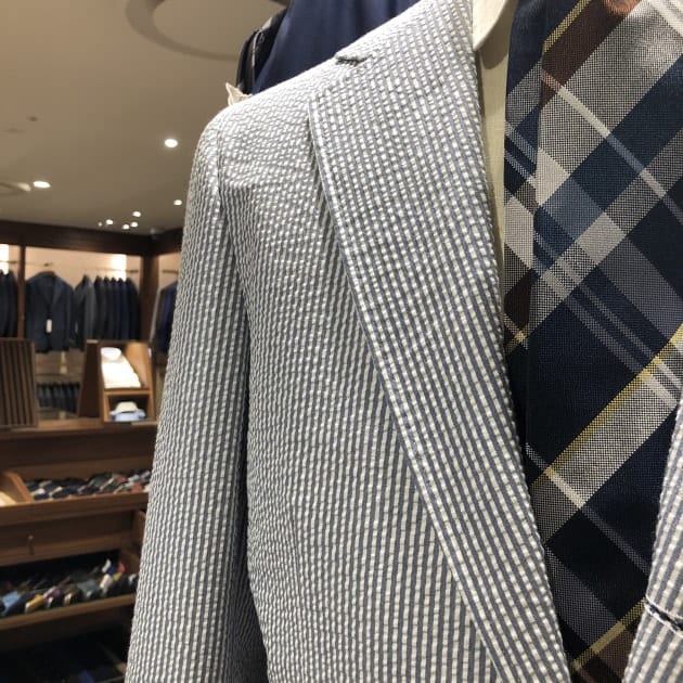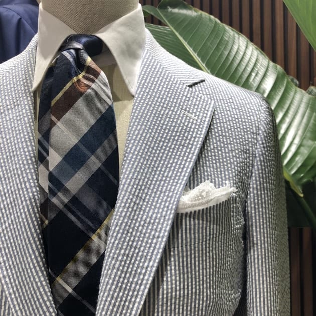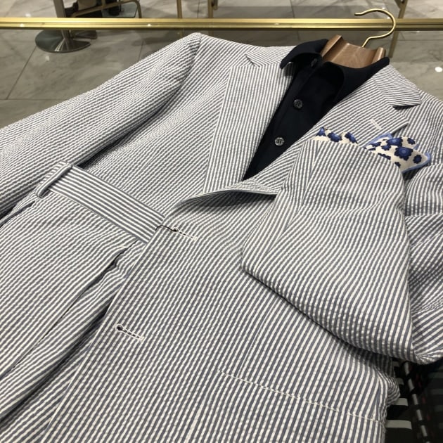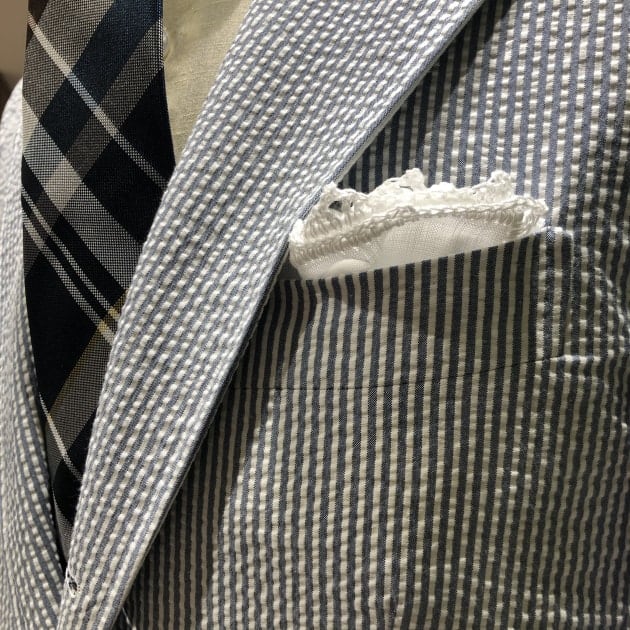 チーフは白リネンのパイピングで、爽やかな風をさらに吹かせます。