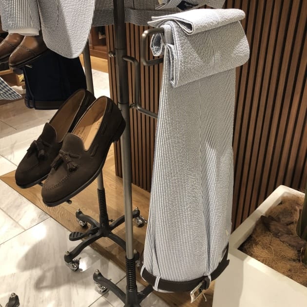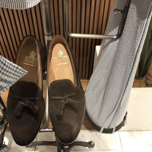 シューズ&ベルトは、スーツのスポーティな雰囲気にあわせてスエードをチョイス。