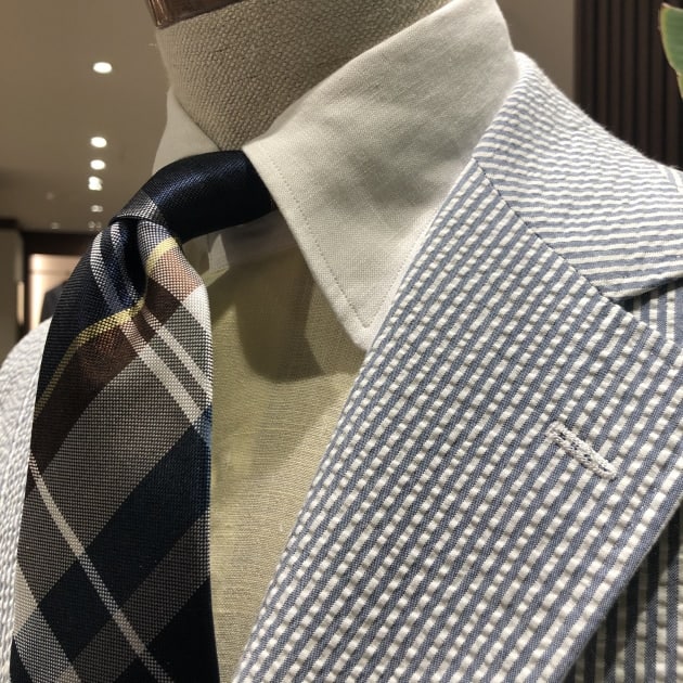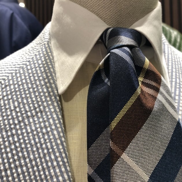 淡いイエローのクレリックシャツ、チェックタイとアイビーテイスト満載。