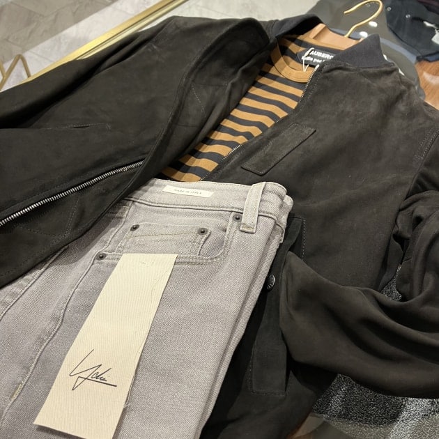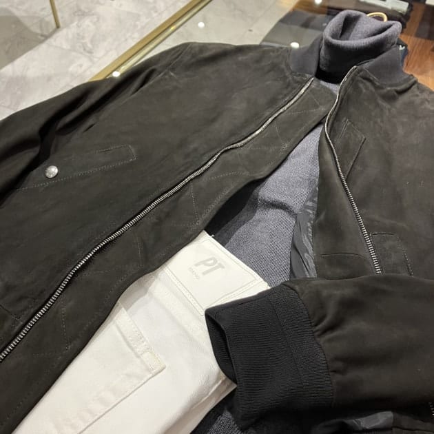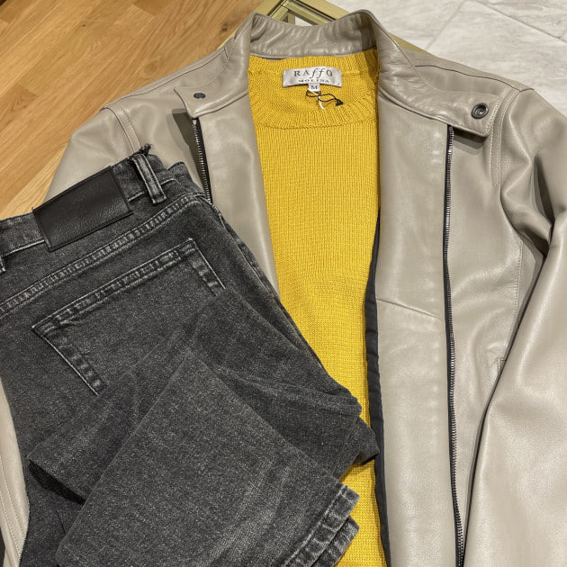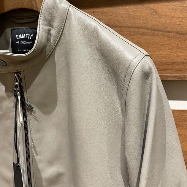 ブラックのライダースですと、ハードなイメージも感じますが、この優しい色ならば馴染みが良さそうですね。