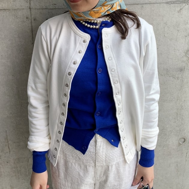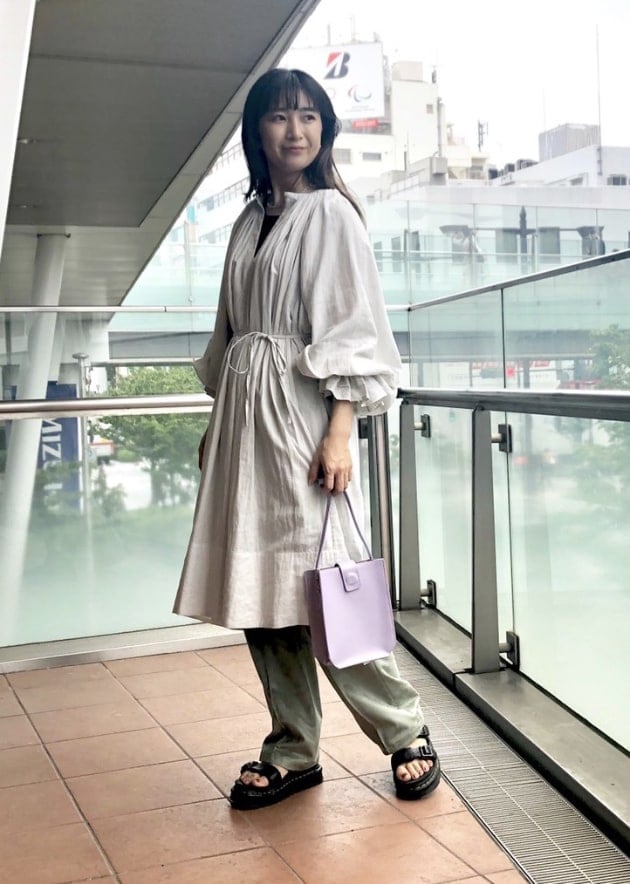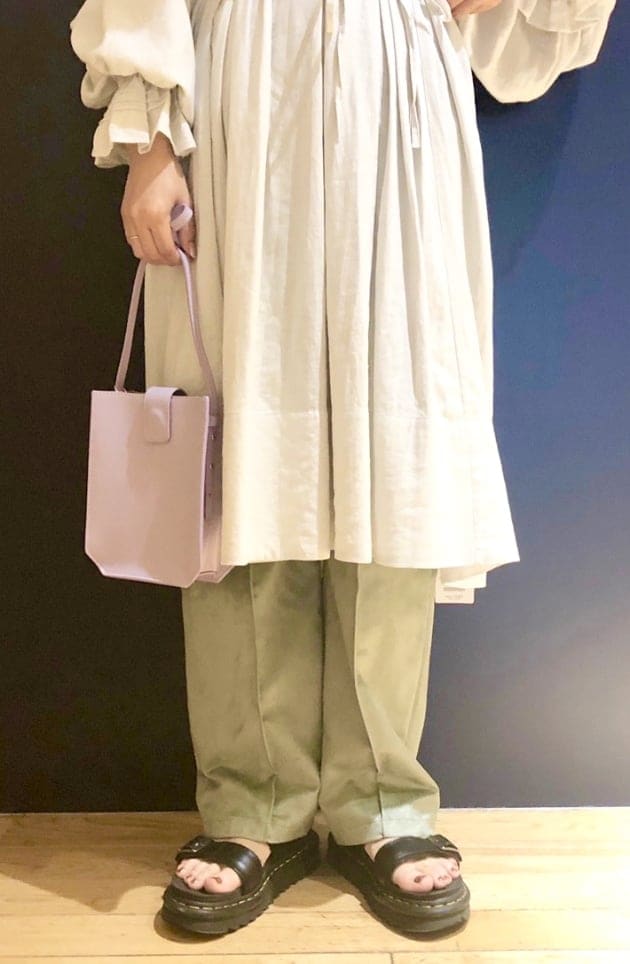 同じカラートーンのスクエアバッグでコーディネートしています。
