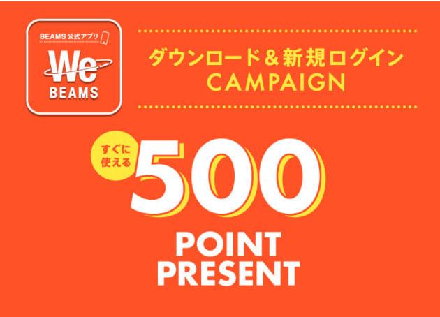 2024年3月29日(金)から4月21日(日)までの期間、BEAMS公式アプリ「WeBEAMS」に初めてログインいただいた方全員に「すぐに使える」期間限定500ポイントをプレゼントします!