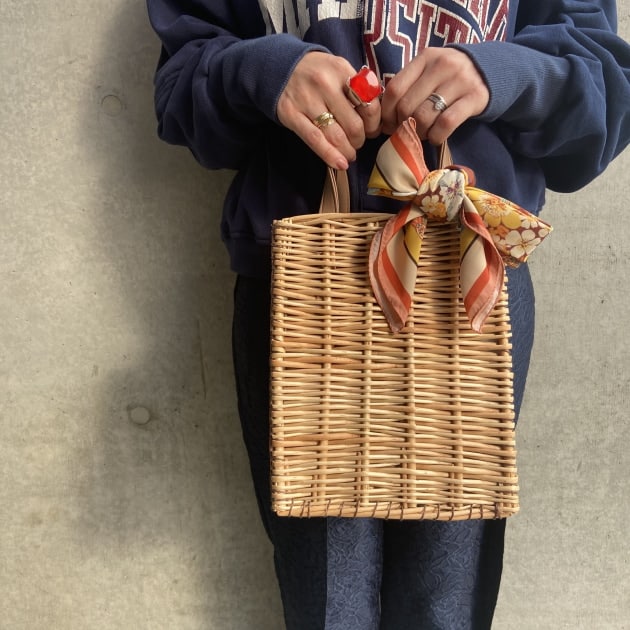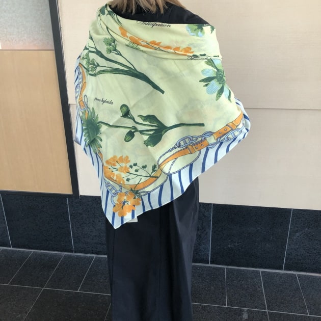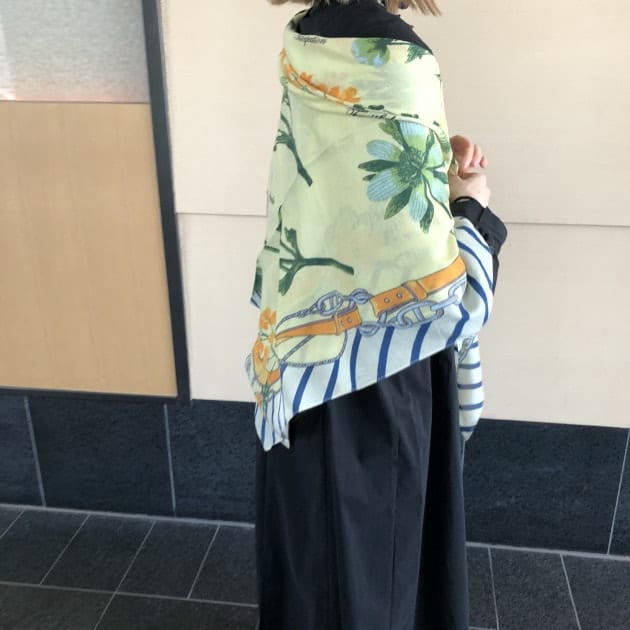 スカーフが初めて、もしくは苦手という方もいらっしゃると思いますが、とりあえず首にさっと巻いてみて下さい。あとアレンジ方法としては頭に巻いたり、カバンの持ち手に巻いたり。応用できるのが良いところでもありますね!