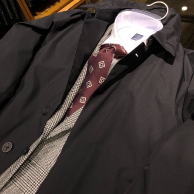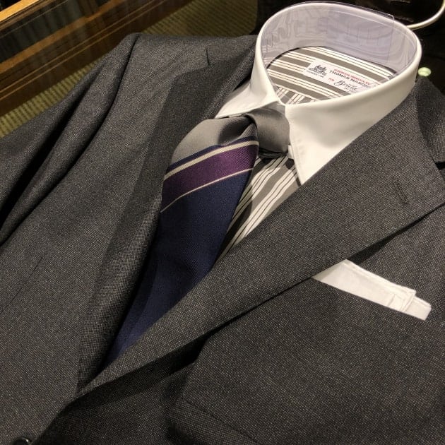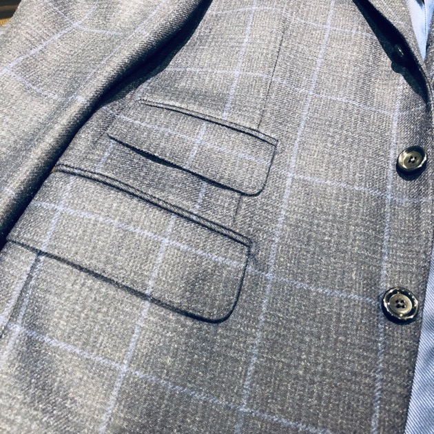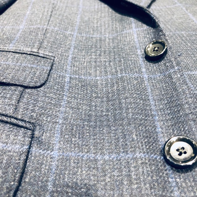 英国らしく打ち込みのしっかりとした生地、一見無地に見えるシャドウチェックは、落ち着いたエレガンスを感じる1着に仕上がっています。