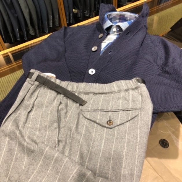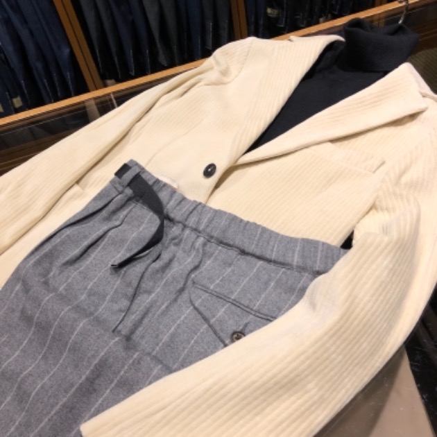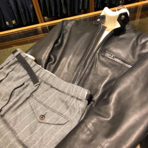 シンプルにカジュアルジャケットに合わせて。ビジネスのスラックスと違って、グレーパンツでもカッチリならなくて良いですね。