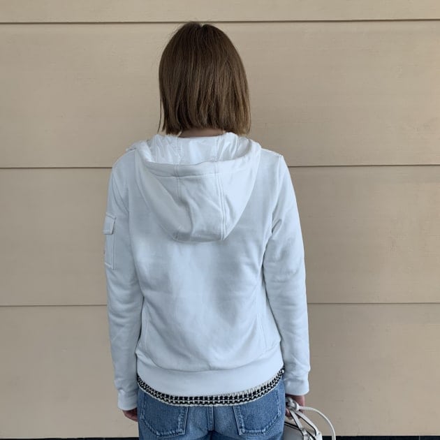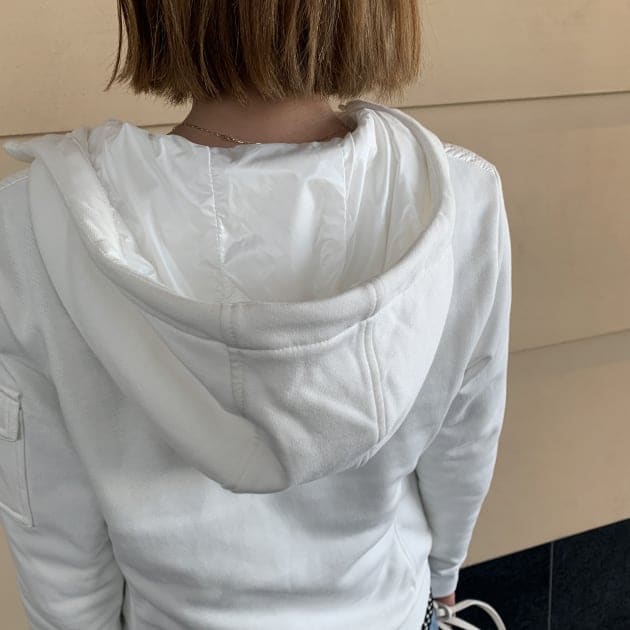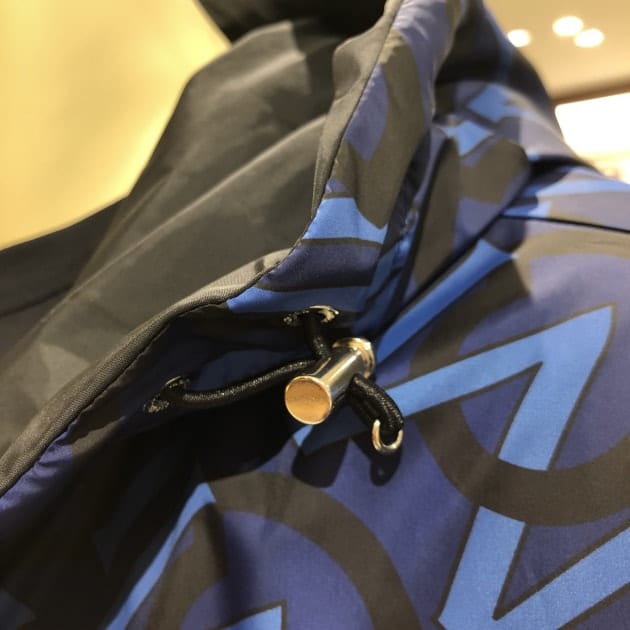 フードに横一直線にあしらわれたトリコロールのリブがブランドらしいアクセントに。
