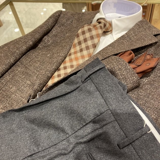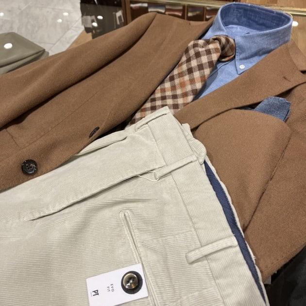 ネイビーブレザーにも合わせたいですが、ブラウン系との組み合わせも似合いますね。