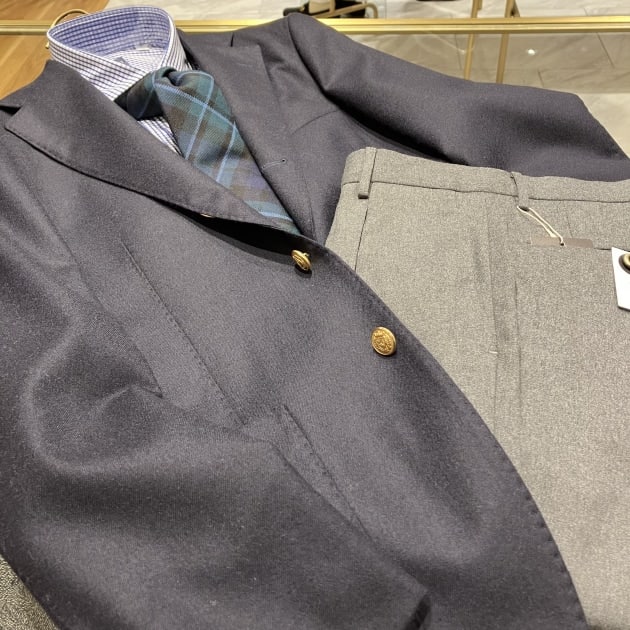 ネイビーブレザーにタータンチェック。