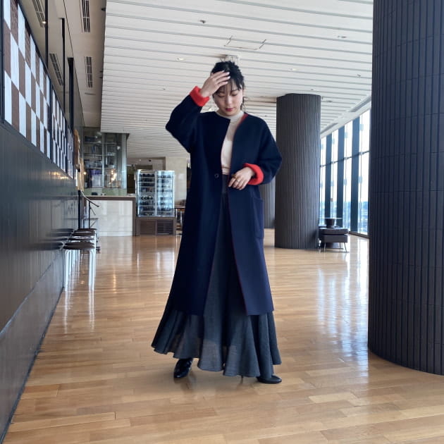 目にも鮮やかなオレンジのショートコートはキャメルとの配色。