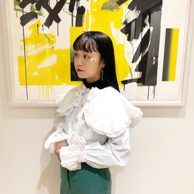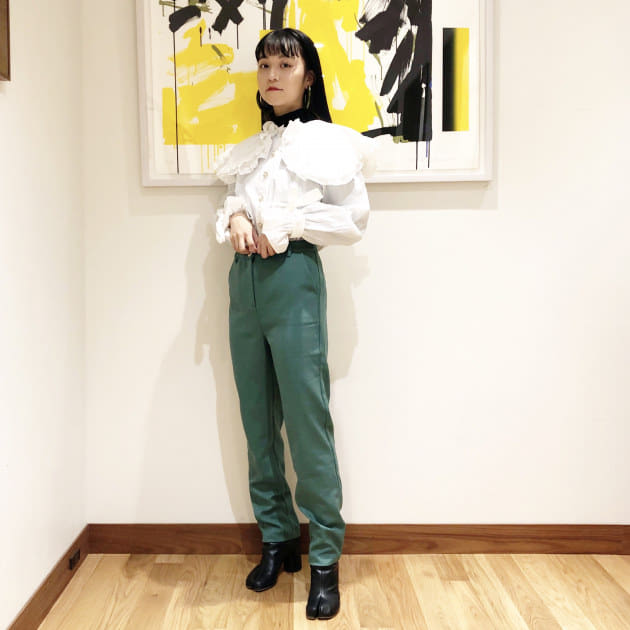わだ「シンプルにスラックスにNEW BALANCE × BUZZ RICKSON'S × BEAMS BOYの別注スニーカー、ベレー帽とミリタリーテイストも少々加えつつフリルシャツを投入し甘辛バランスに仕上げました。」