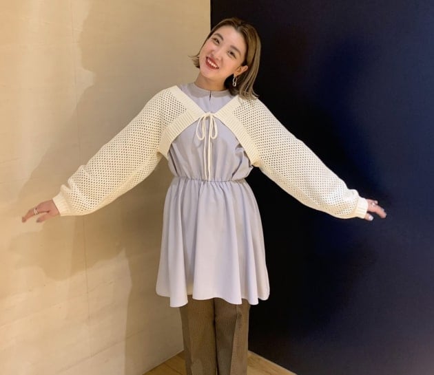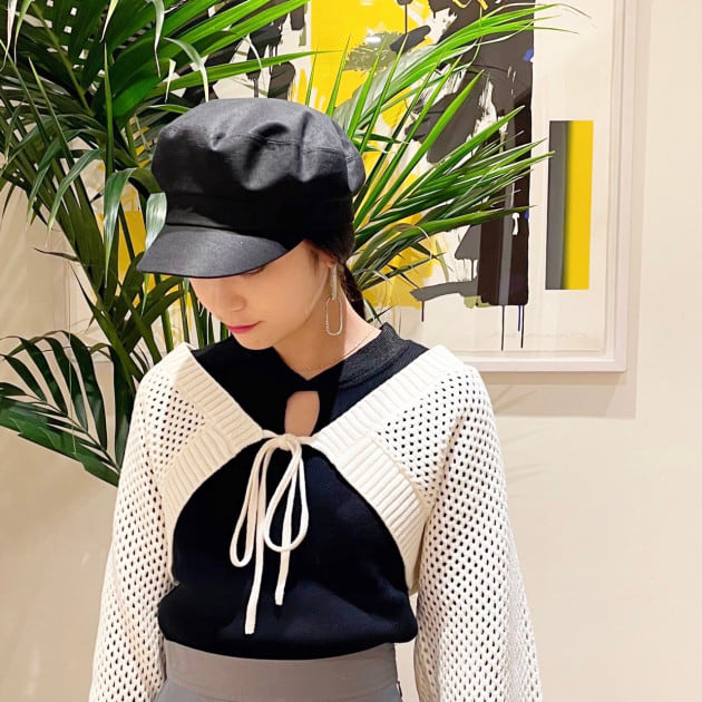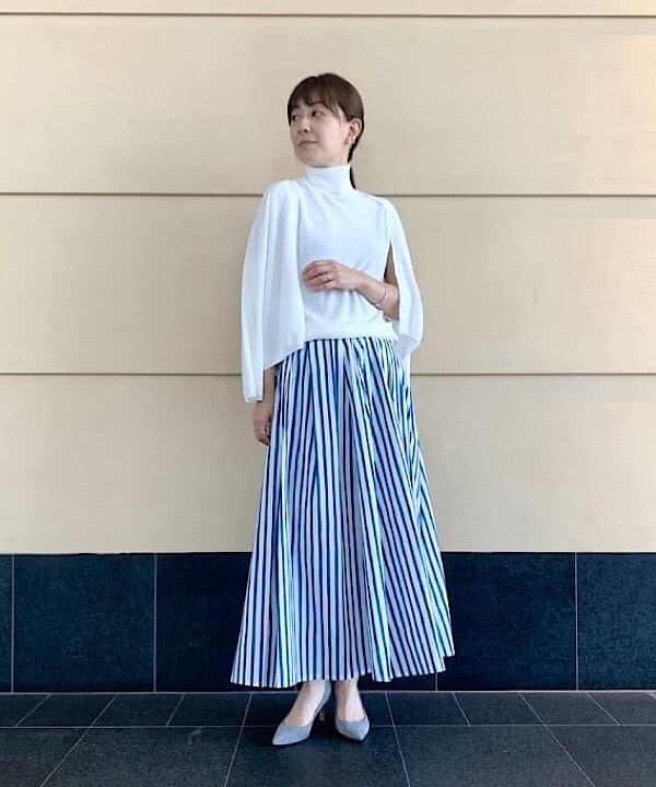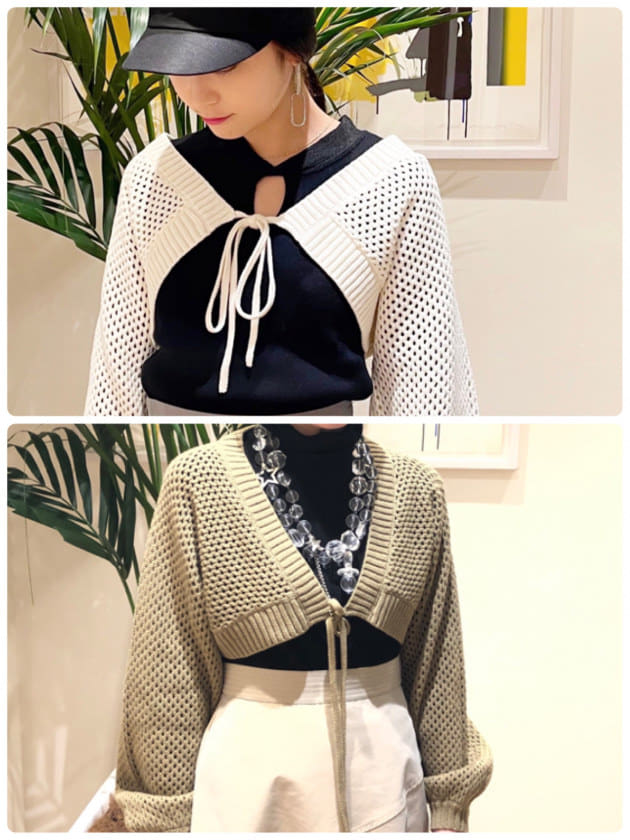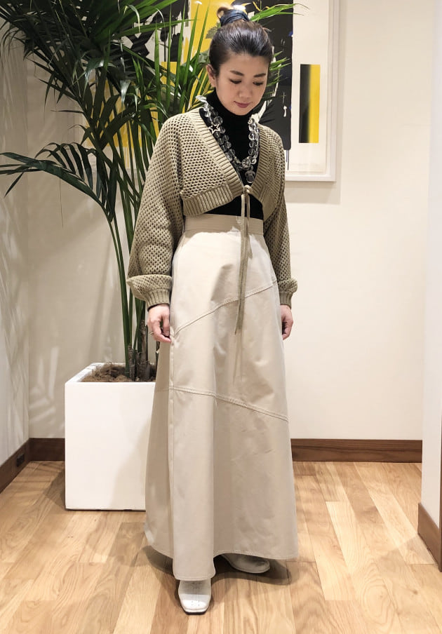 ショート丈はハイウエストのボトムスやワンピースとも相性が良いです◎