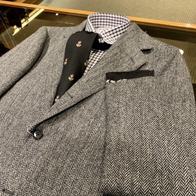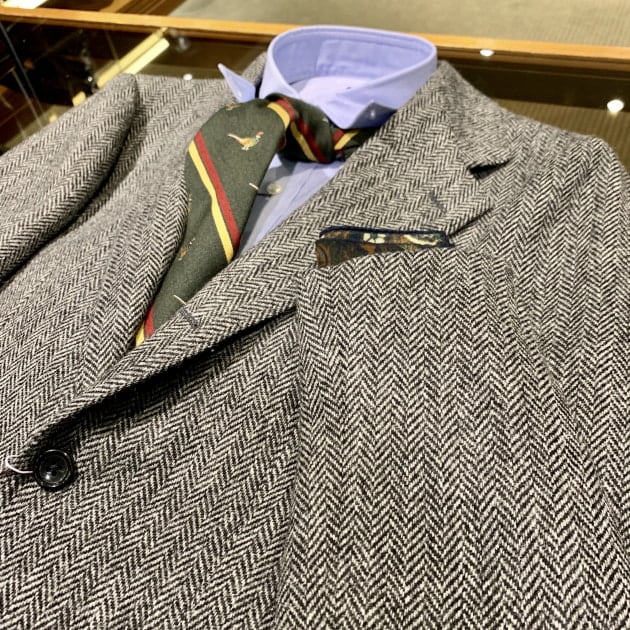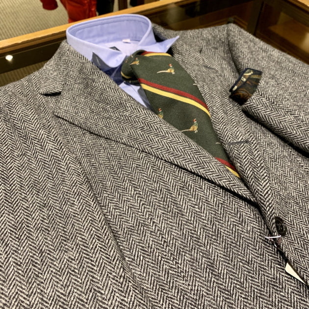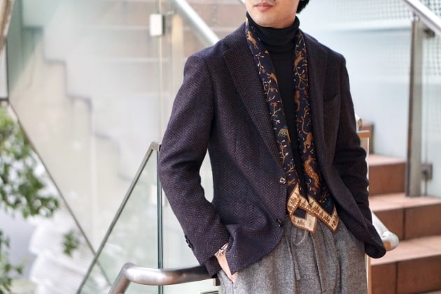 ウールタイにすることで、ジャケットの素材感とマッチさせたのもポイント。