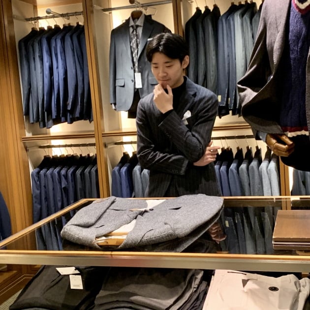 チーフも、サックスの縁どりでシャツの色味とさりげなく合わせて…こういうの好きなんですよねぇ、、わたくし。