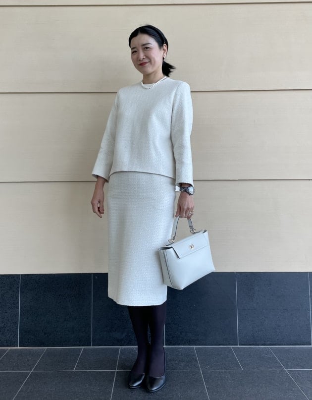 春らしく、白いツイードジャケットを
