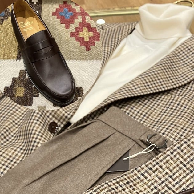 仕立ては、日本の名門ファクトリー〈RING JACKET(リングヂャケット)〉によるもので、美しいシルエットと立体的なパターンが特徴です。