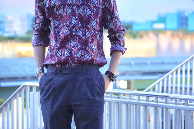 このようにボタン2つ開けのドレス風着こなしでも、リラックス感がありサマになります。