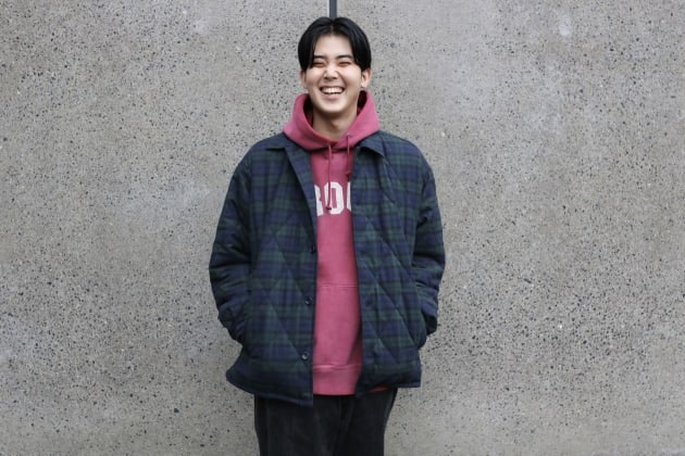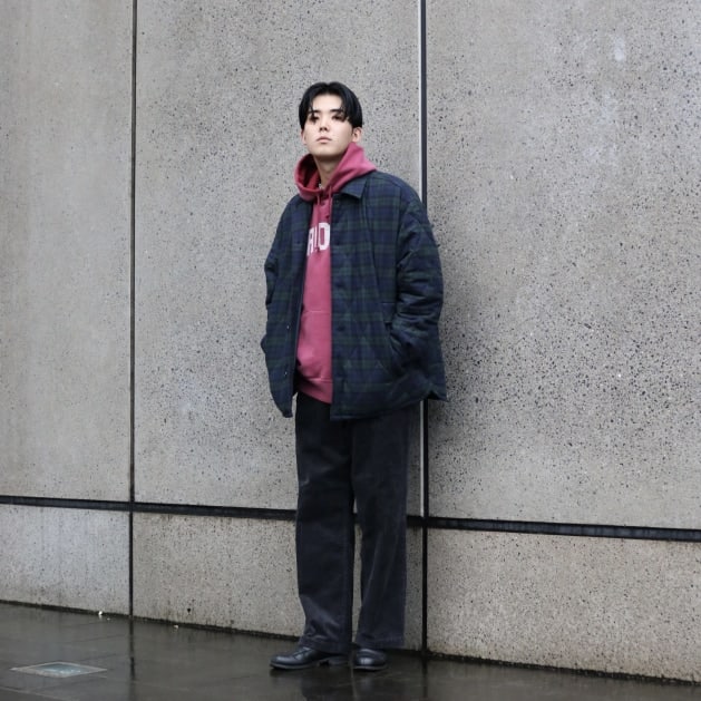 僕は、中綿キルティングCPOジャケットのインナーにバーガンディの「BROWN」をチョイス!