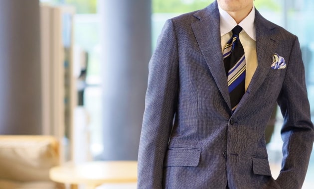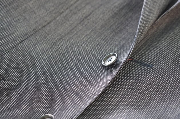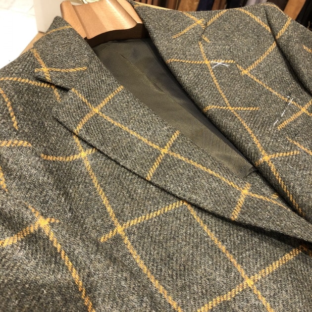 ハリのあるキャバルリーツイルは、ラペルのロールが綺麗に出るんです。