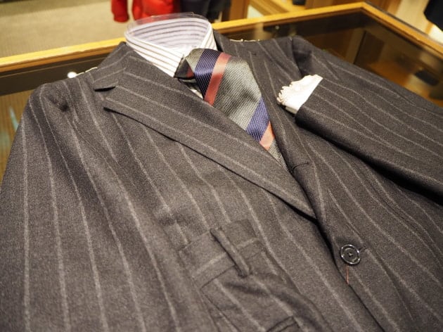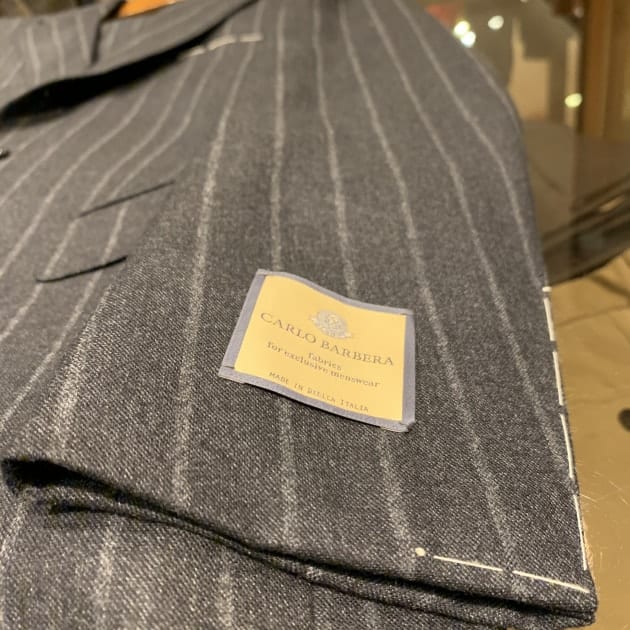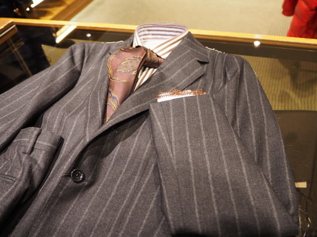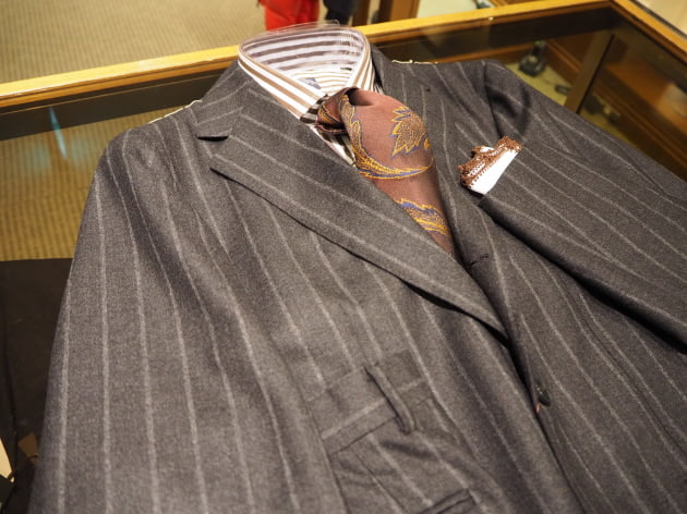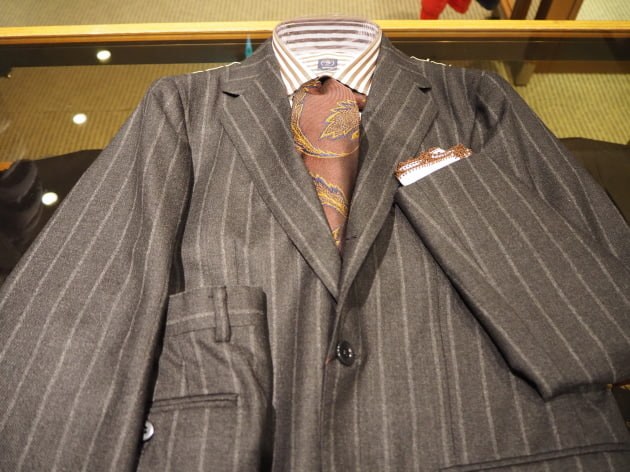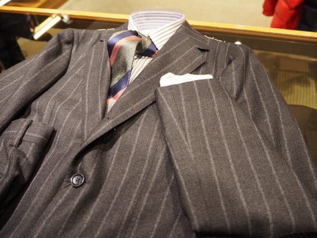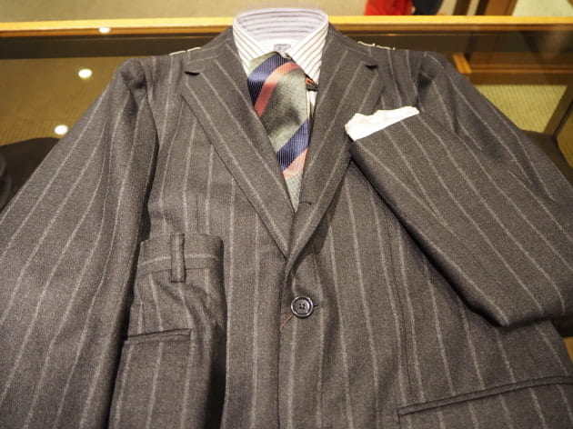 チャコールグレーに走る、幅広のチョークストライプ。少し掠れた表情も魅力的。