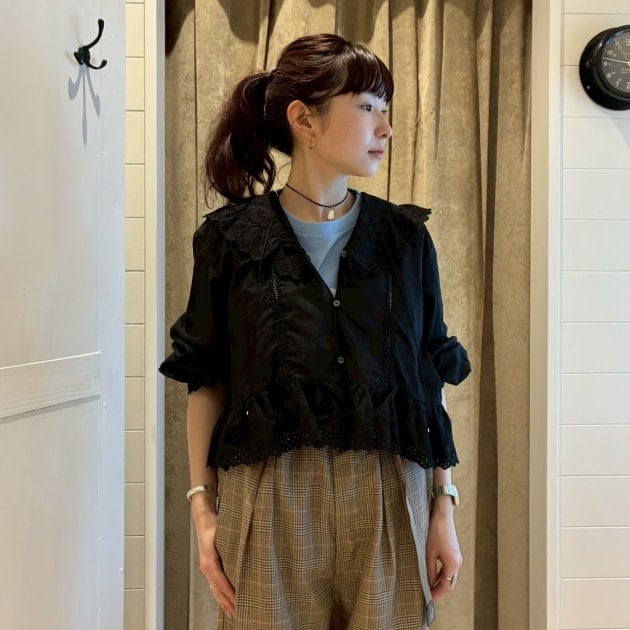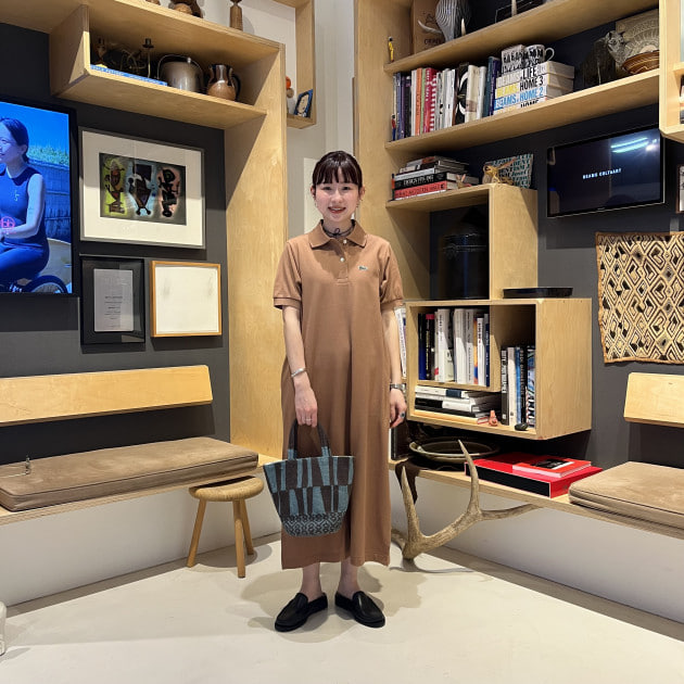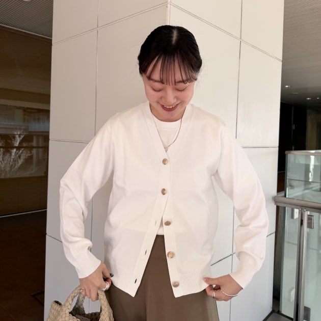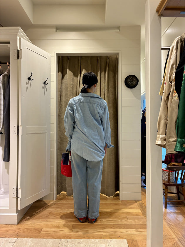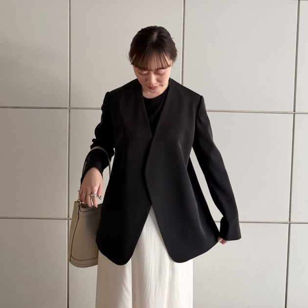 着用画像です。普段サイズ44の私が、サイズ44着用で自然なサイズ感です。少し袖が長いくらいですね。全体的にはやや丸みを感じるシルエット感。肩周りの感じはリングヂャケット製の立体的な作りの特徴が感じられました。
