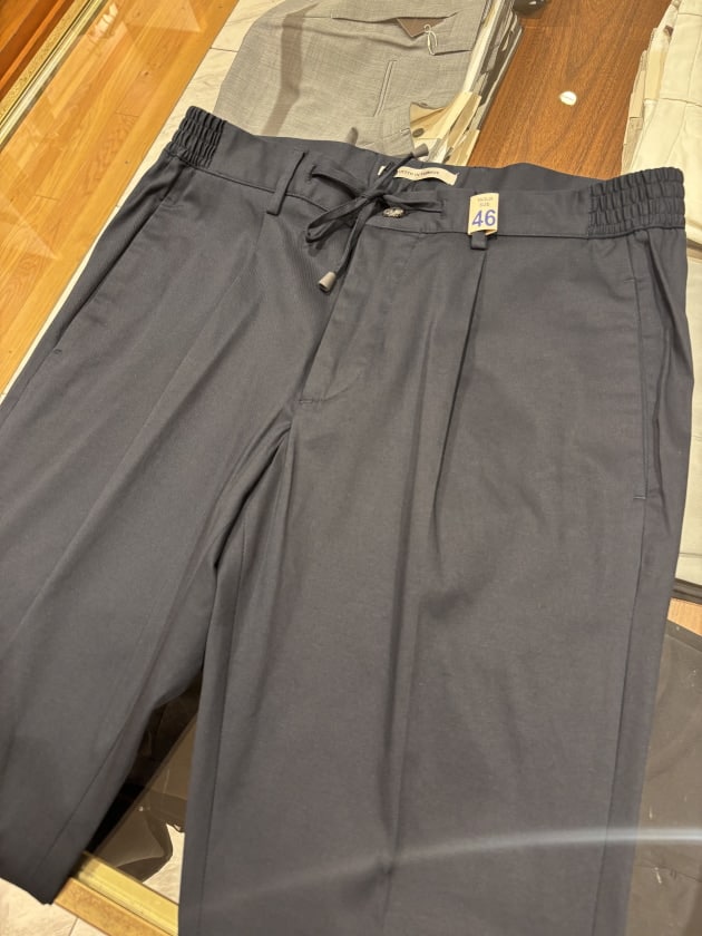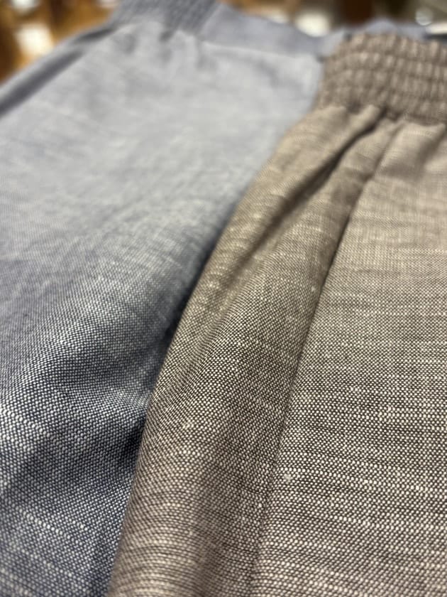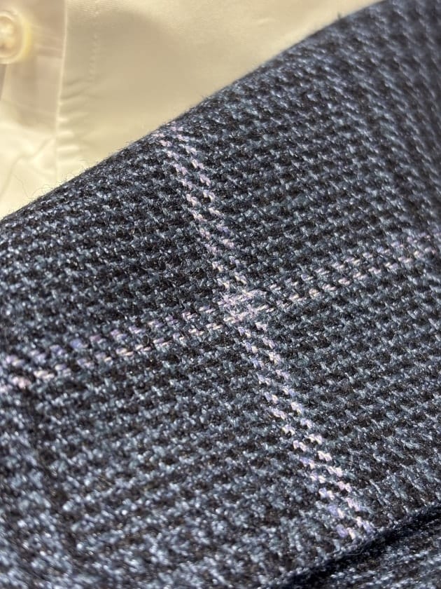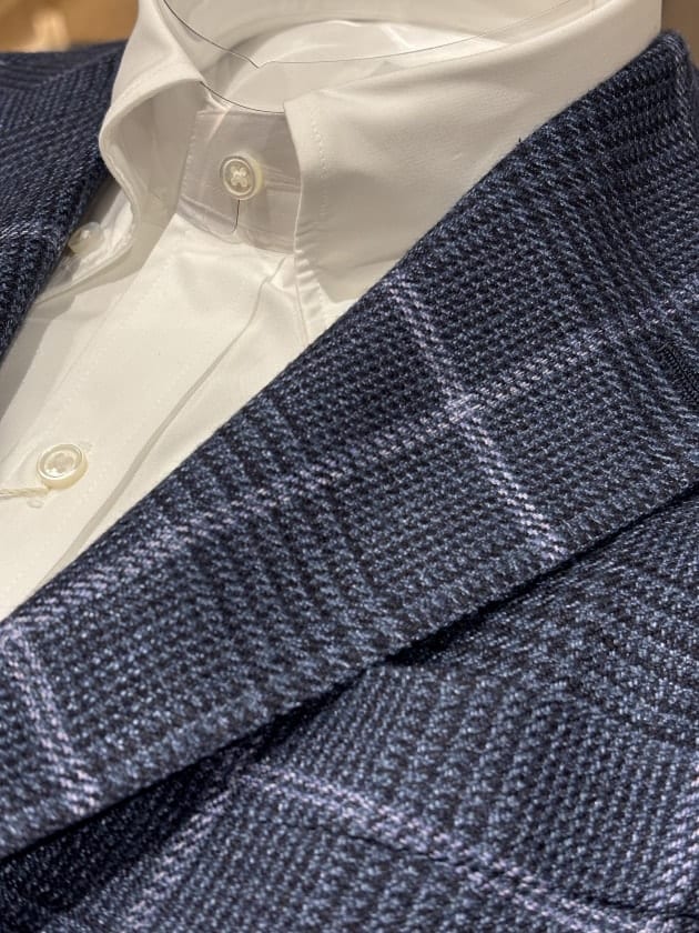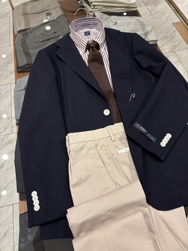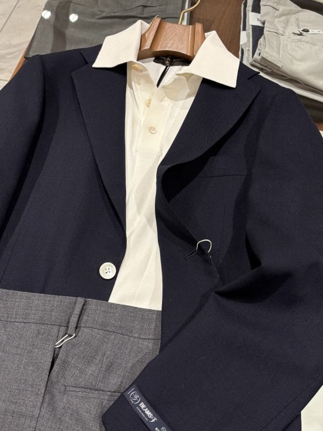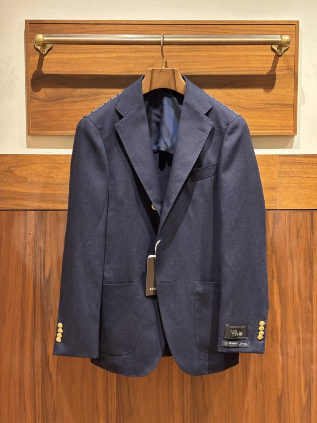 イタリアの生地メーカーLEO MASTERのウール55%リネン45%生地を採用しています。若干浅い発色のNAVYカラーで、春夏シーズンらしい素材感。次の画像↓が実際の色合いに近い写りです。
