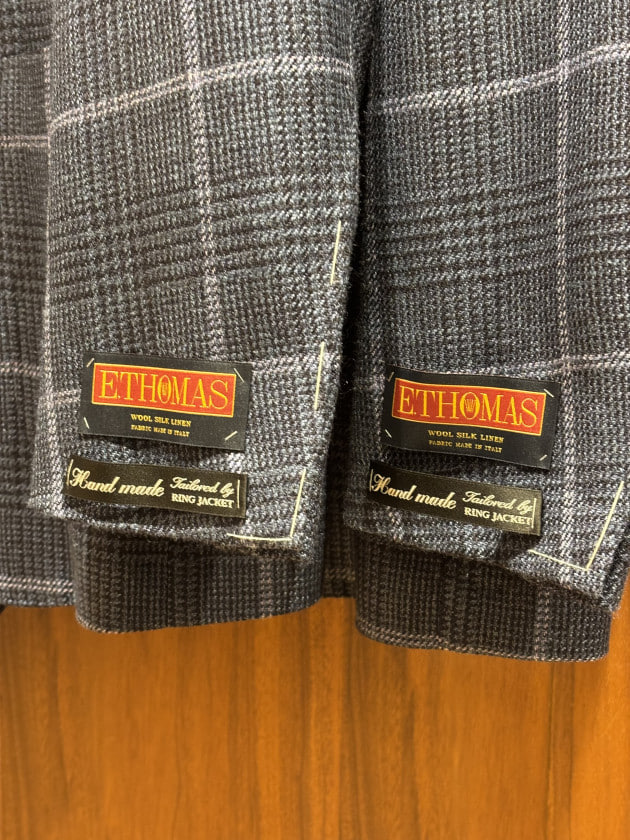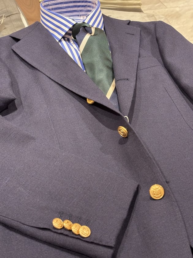 そしてゴールドメタルボタンです。袖ボタンも初めから付いておりますので、寸法に問題がなければすぐにお召し頂けます。