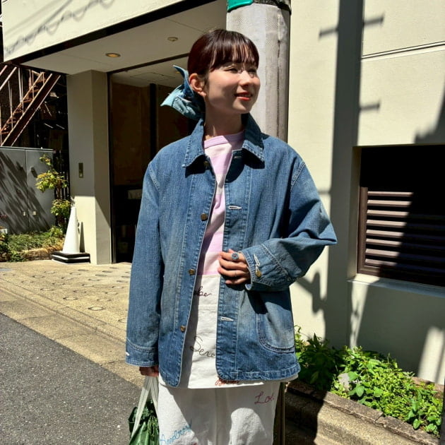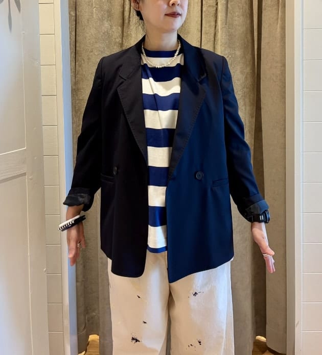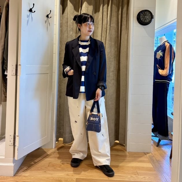 上下ともにたっぷりなシルエットなのでジャケットでカチッと感も出してバランスを取ってみました!!