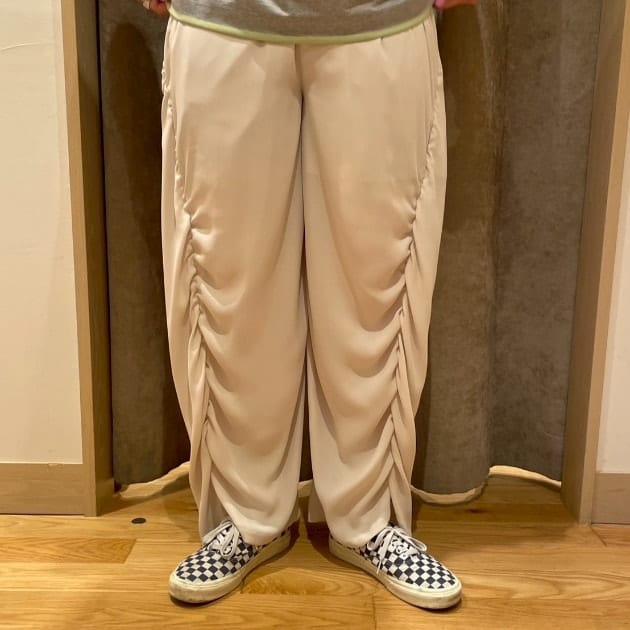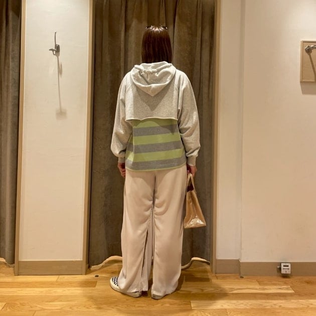 夜はまだ寒いな〜という今時期に活躍します。抜け感の出る〈maturely〉のパンツも〈IVORY〉をチョイスしやわらかい色味で合わせてみました◎