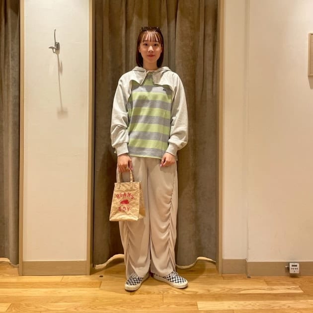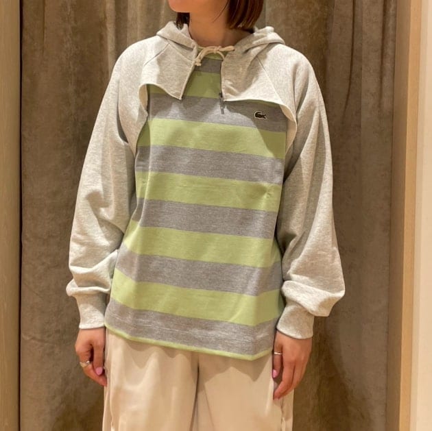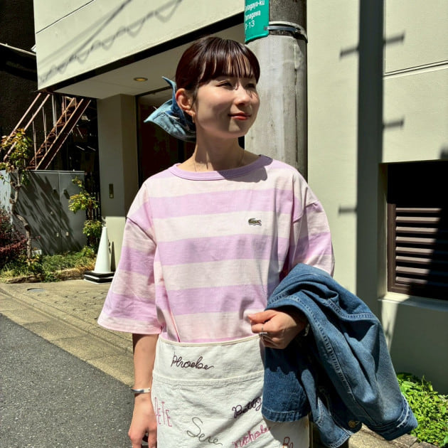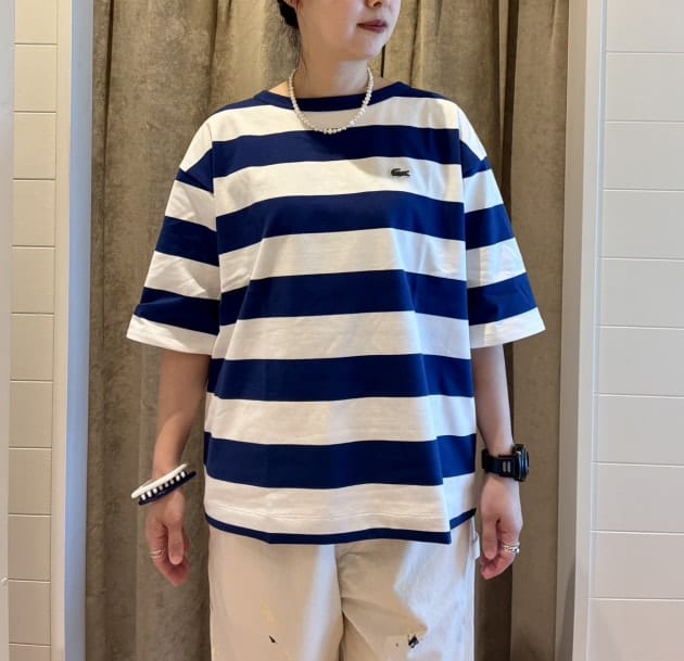 LACOSTE〉別注のボーダーTをメインに、ルーズテイストのスタイリングに。私はグリーンのサイズ〈38〉をチョイス。
