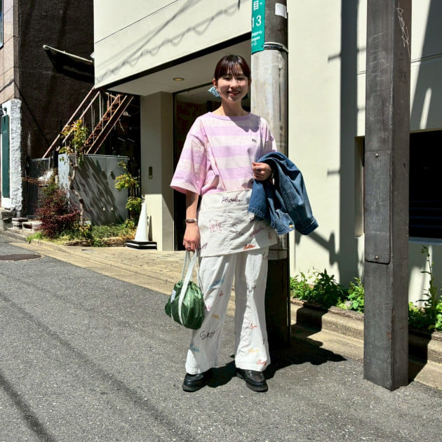 春らしい淡いピンクのTシャツに合わせて、全体も淡いカラーでコーディネートしました。