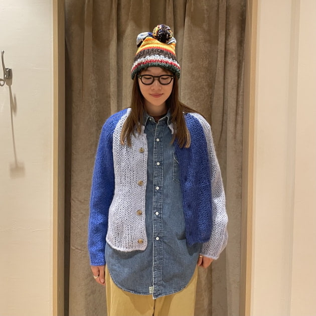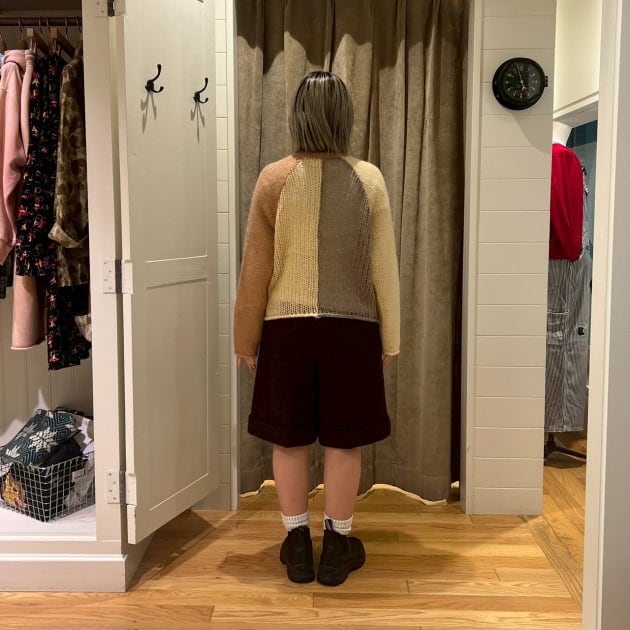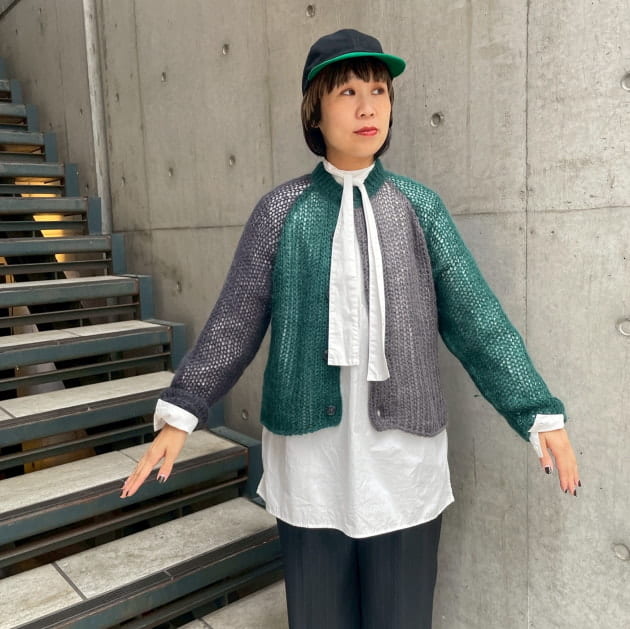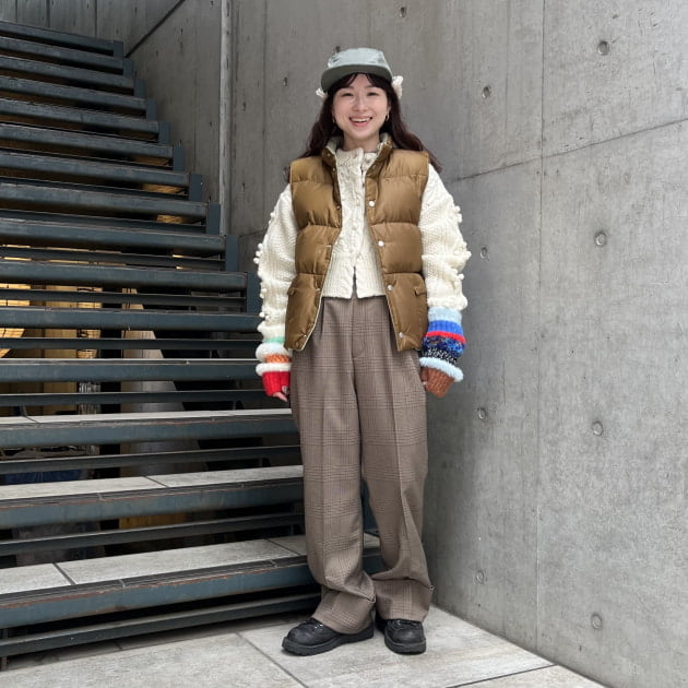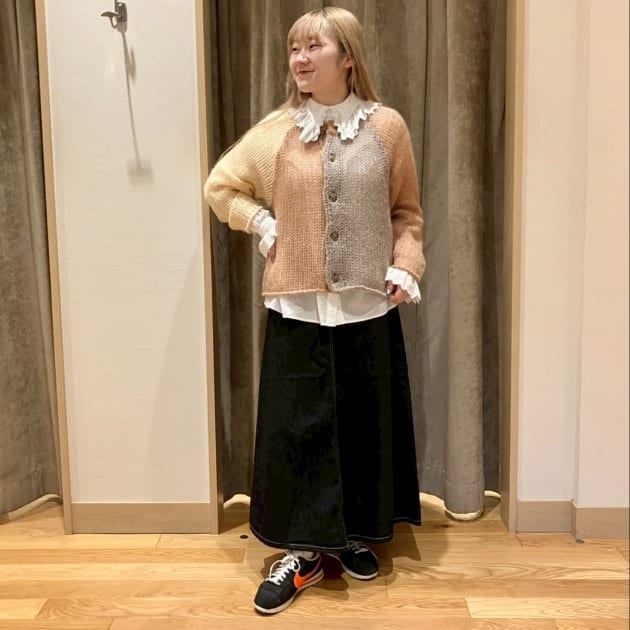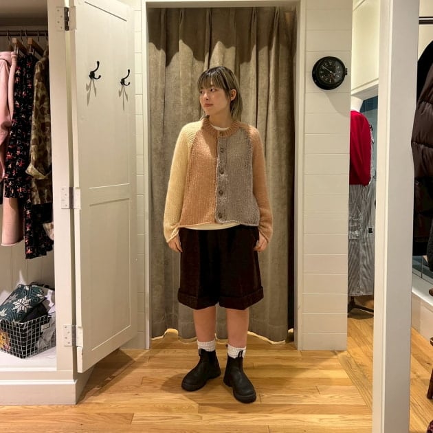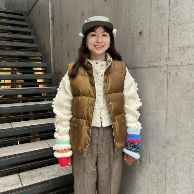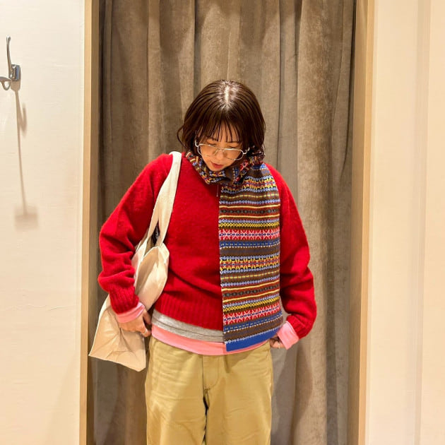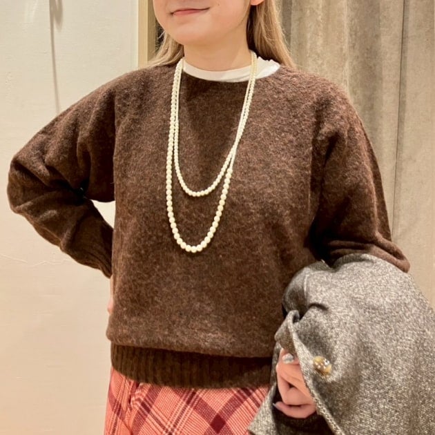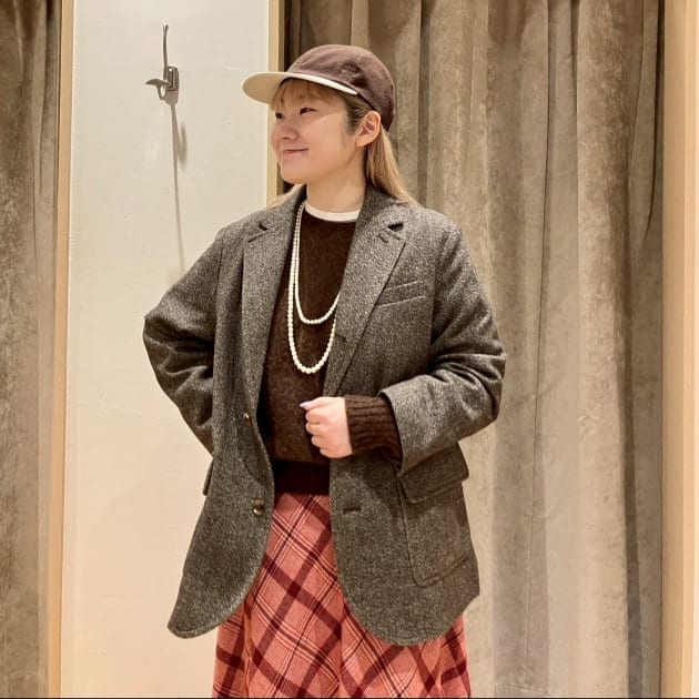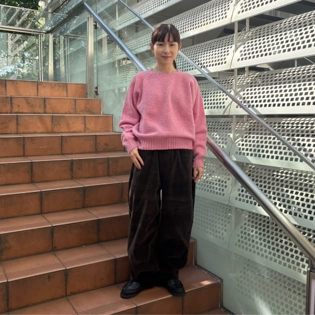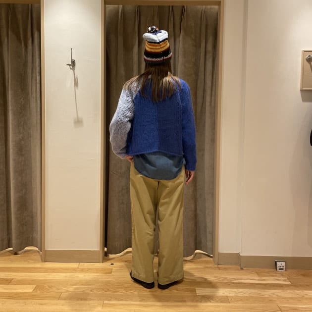私は、普段選ばないブラウンをチョイス。よくよく見るとブラウンの他にも毛糸が混ざっており、ミックスのようなカラーになっています!ウール特有のちくちく感が少なく、快適に着ていただけます◎