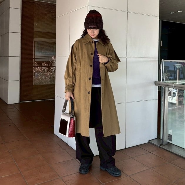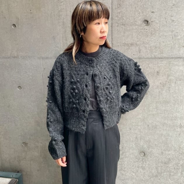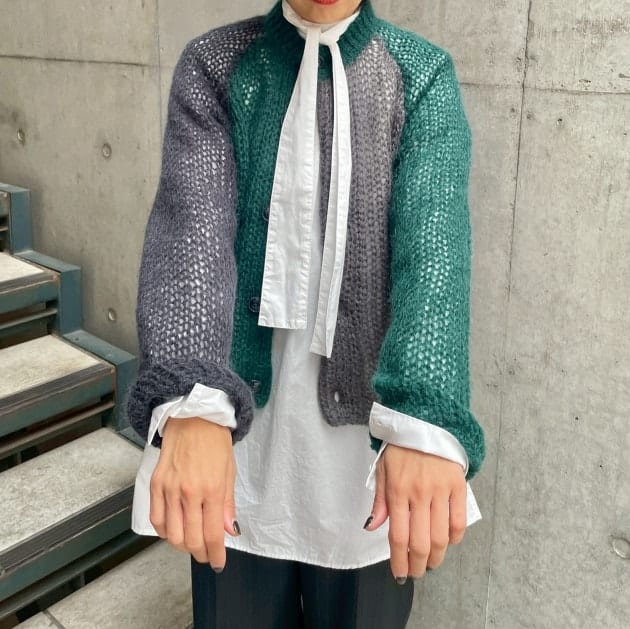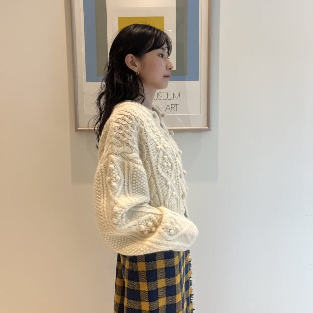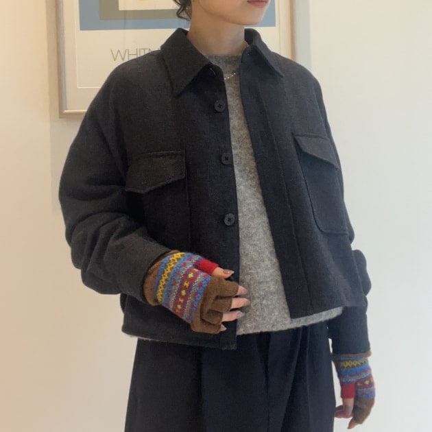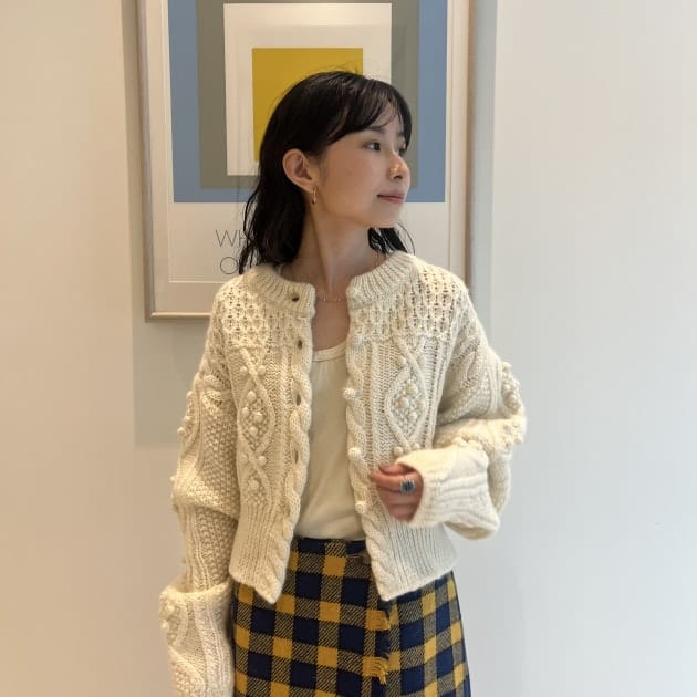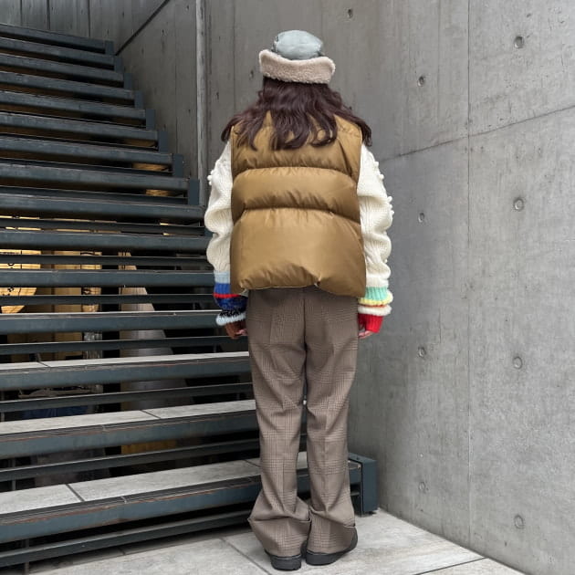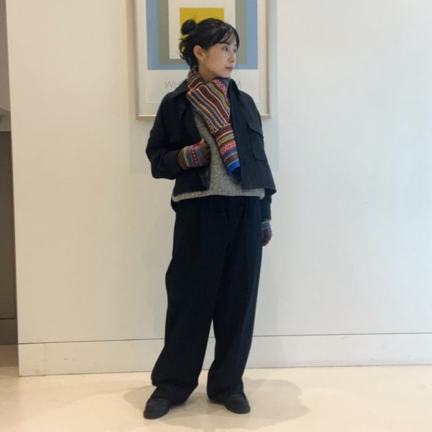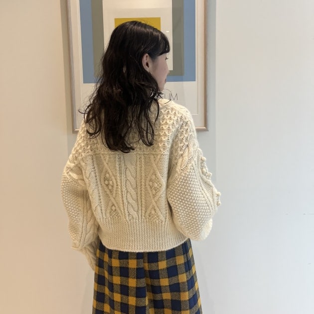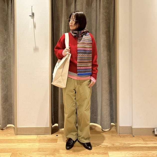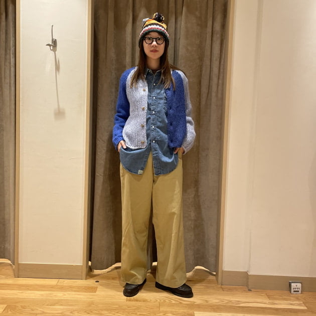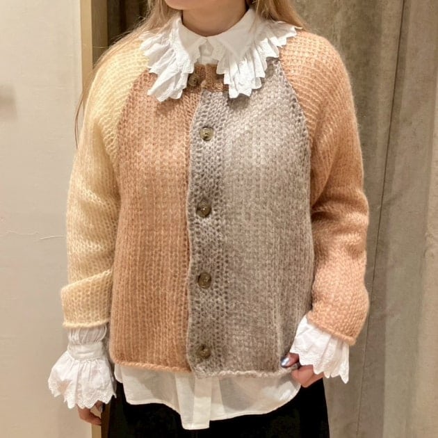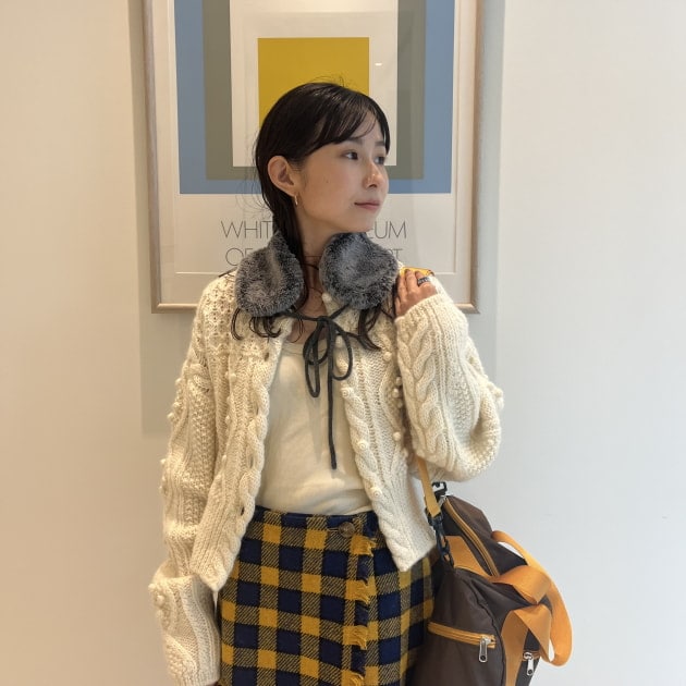 私は、普段選ばないブラウンをチョイス。よくよく見るとブラウンの他にも毛糸が混ざっており、ミックスのようなカラーになっています!ウール特有のちくちく感が少なく、快適に着ていただけます◎