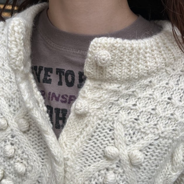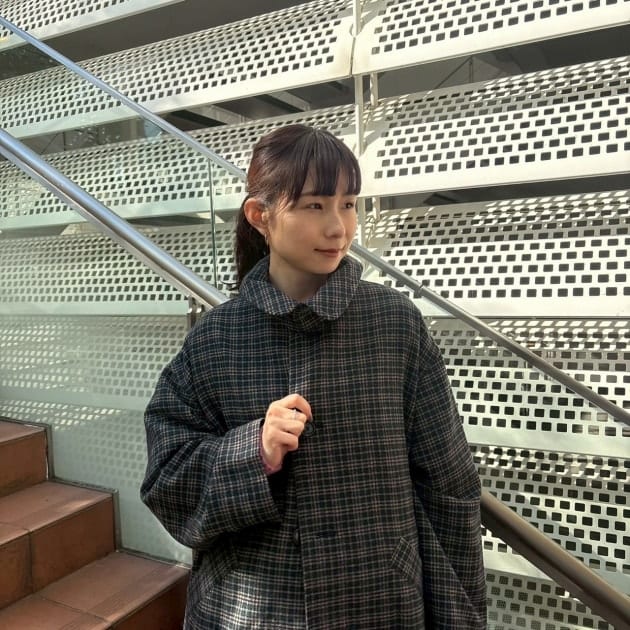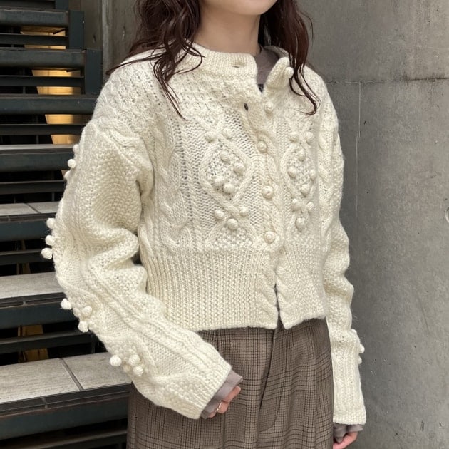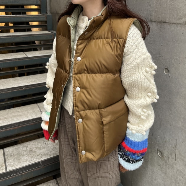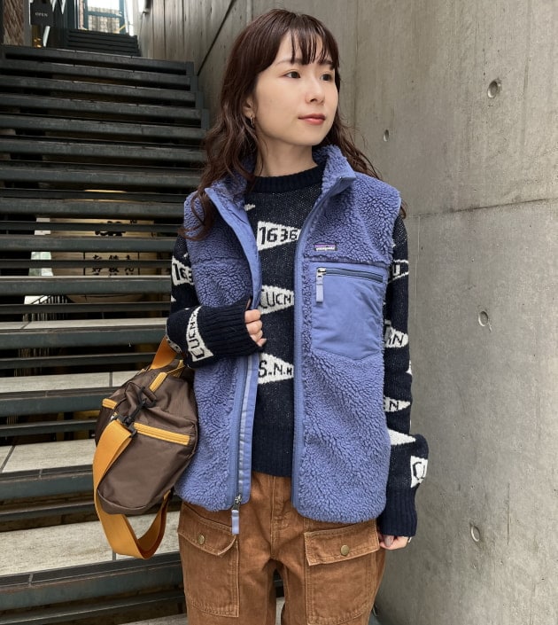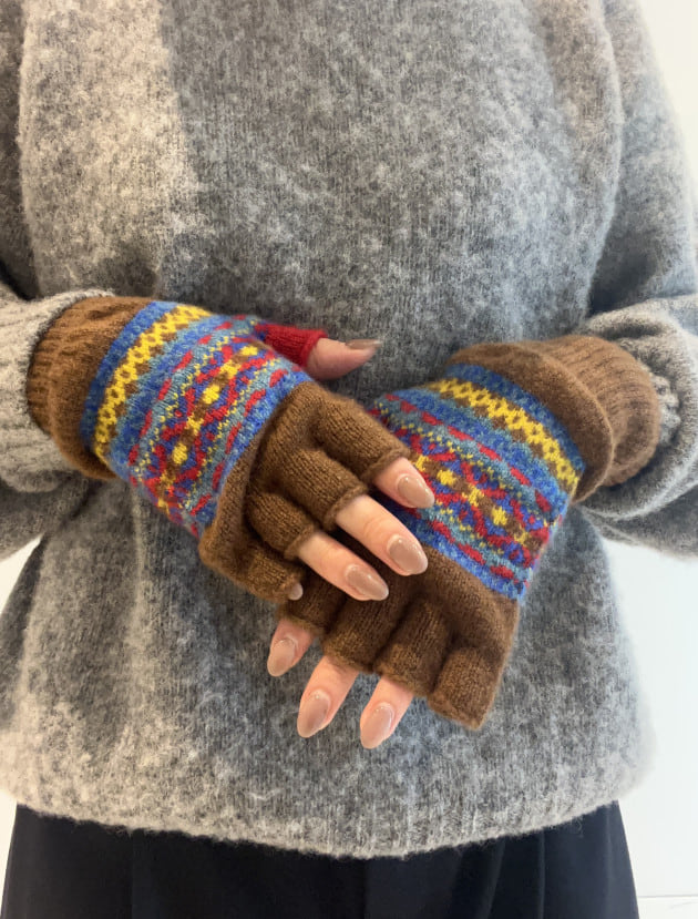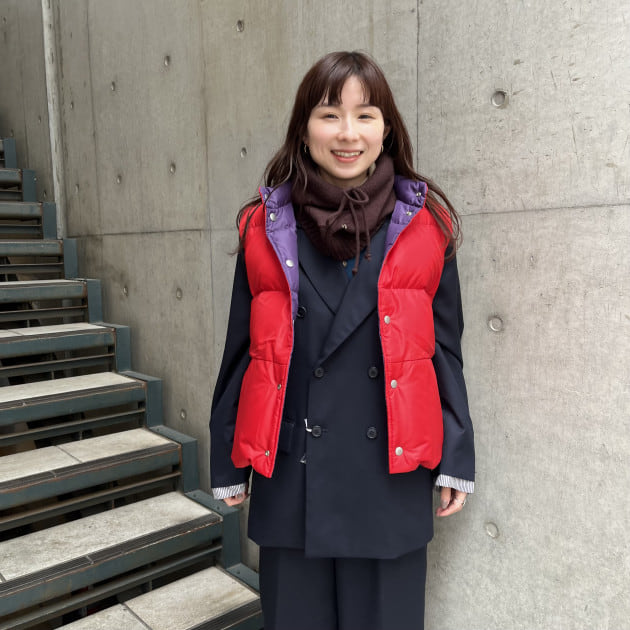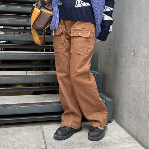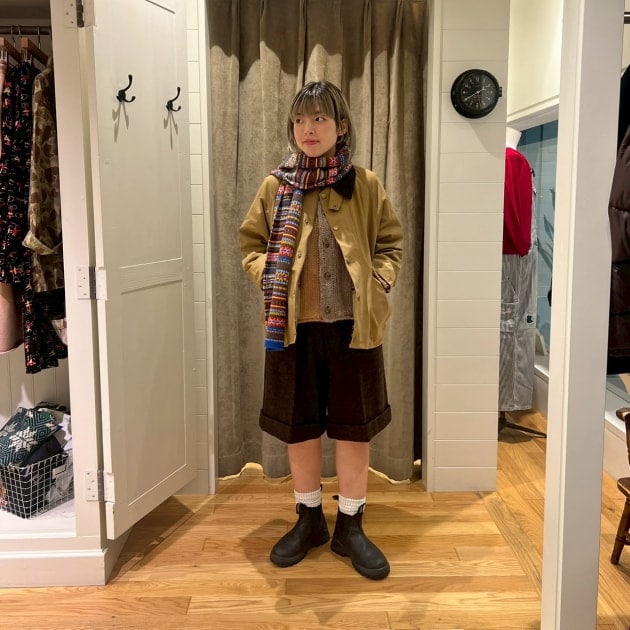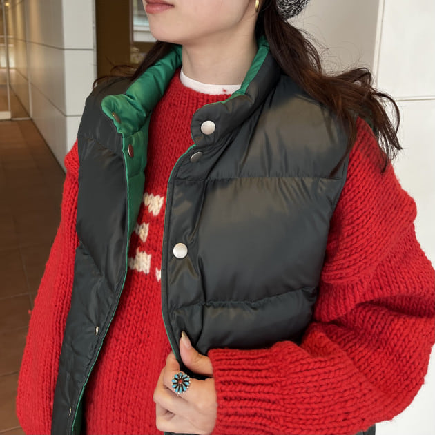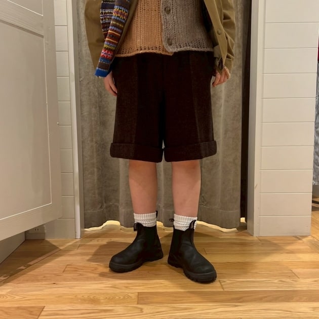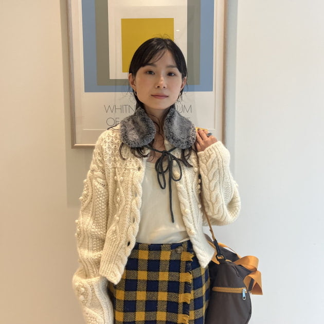 私は、普段選ばないブラウンをチョイス。よくよく見るとブラウンの他にも毛糸が混ざっており、ミックスのようなカラーになっています!ウール特有のちくちく感が少なく、快適に着ていただけます◎
