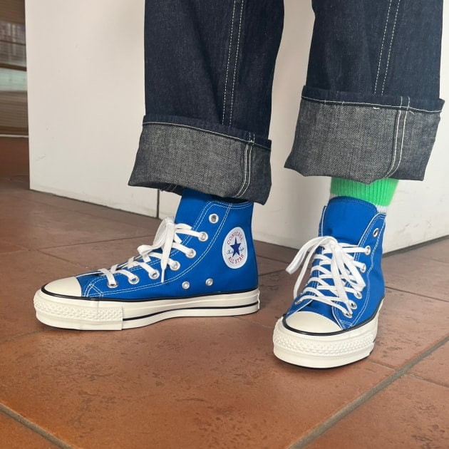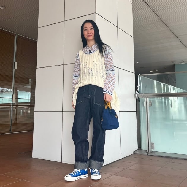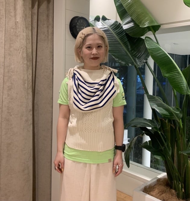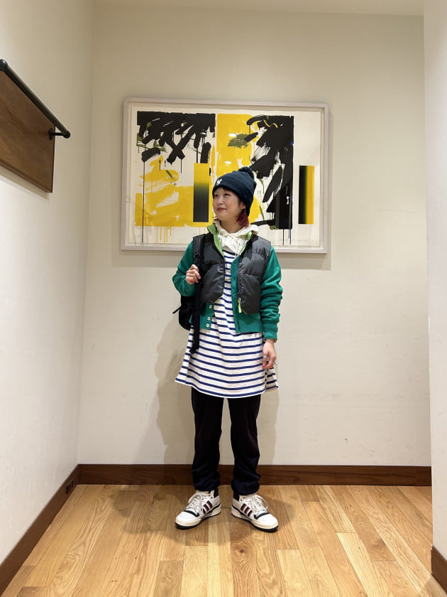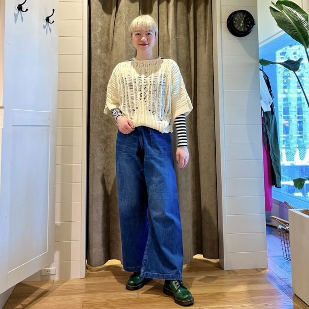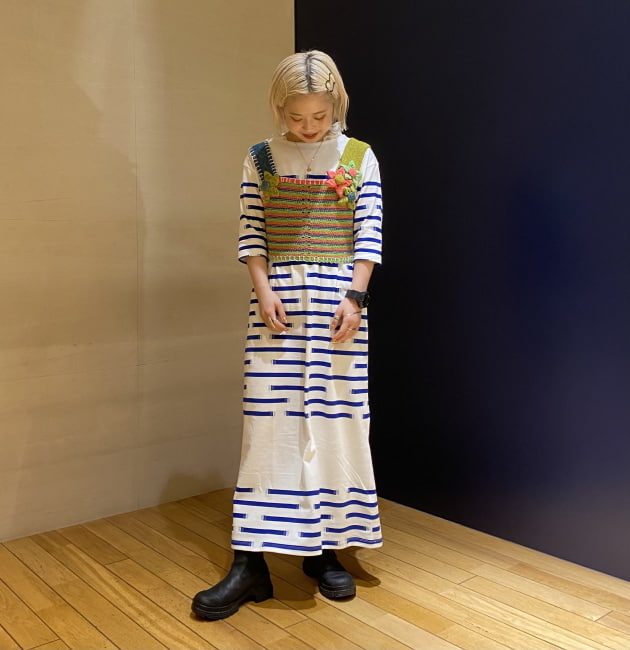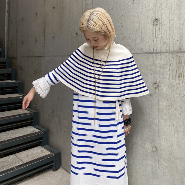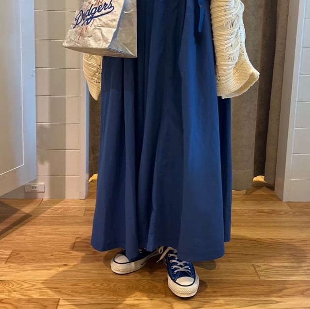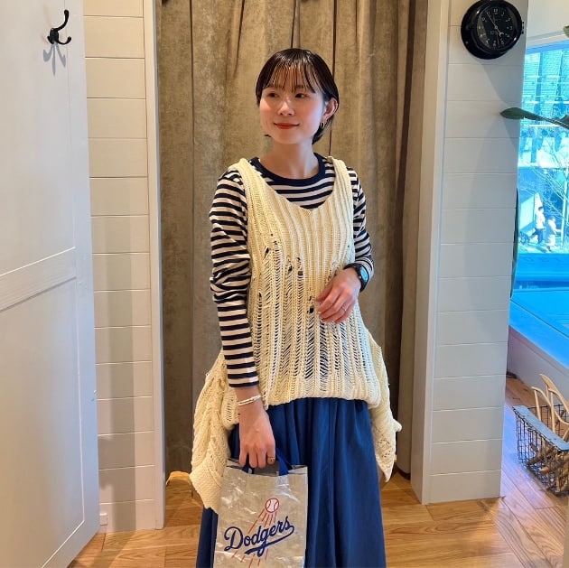 コーディネートは、ニットで女性らしい柔らかな雰囲気も出しつつ、基本はボーダーカットソーや〈CONVERSE〉など、ベーシックアイテムで合わせました。スカートのブルーが爽やかなので、アクセントになりますよ〜