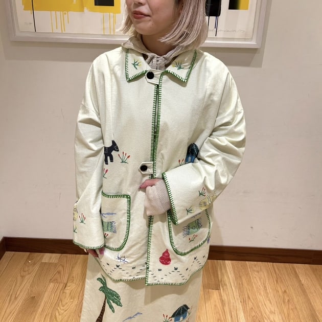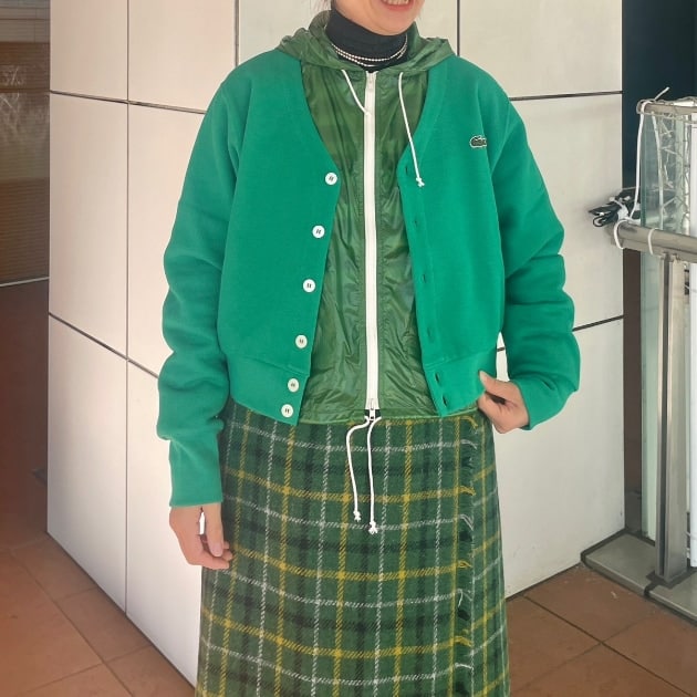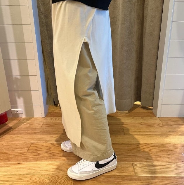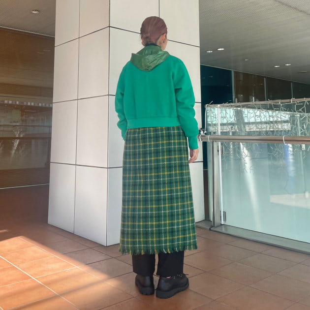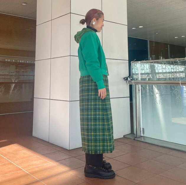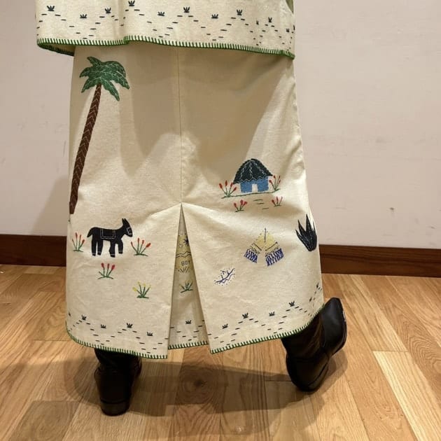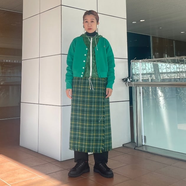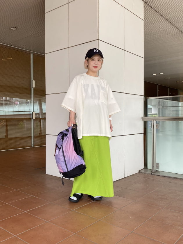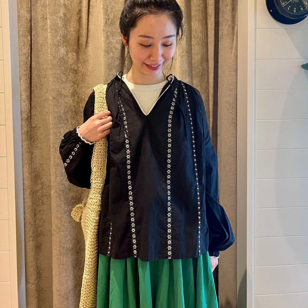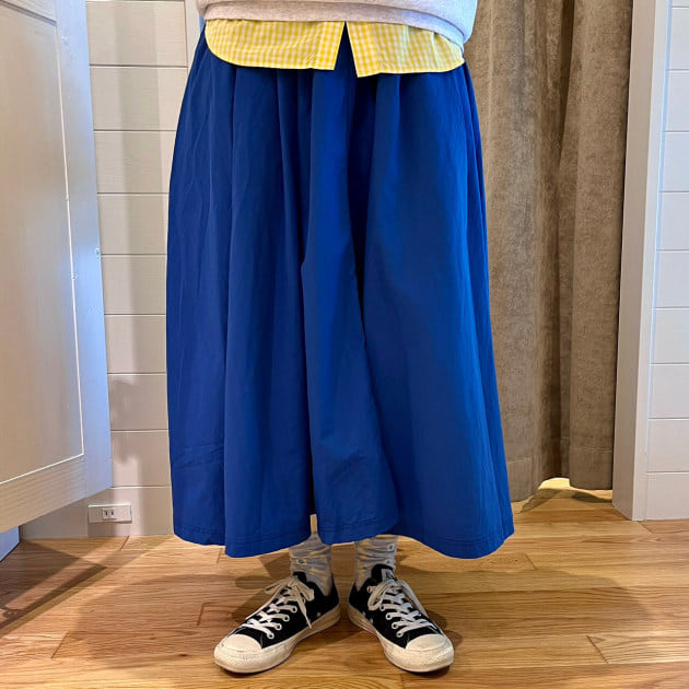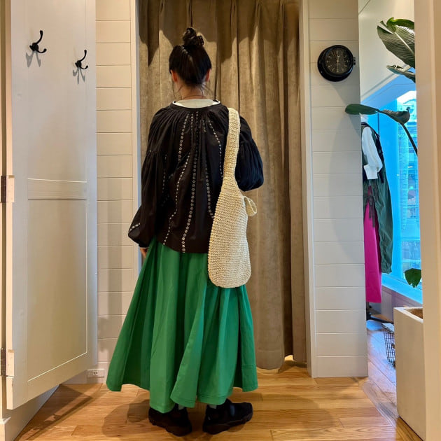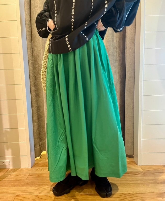 私は刺繍スモックに合わせてみました!インナーのTシャツもスカートに合わせてグリーンにしたのがポイント◎軽くてはきやすいスカート!!