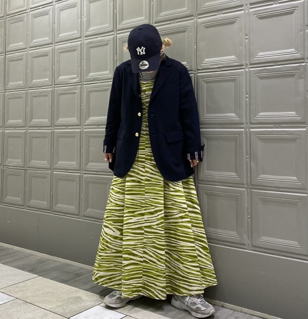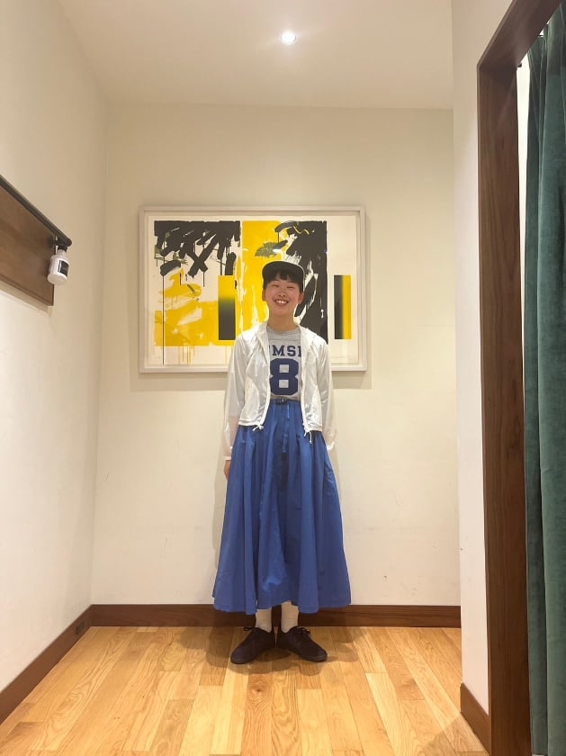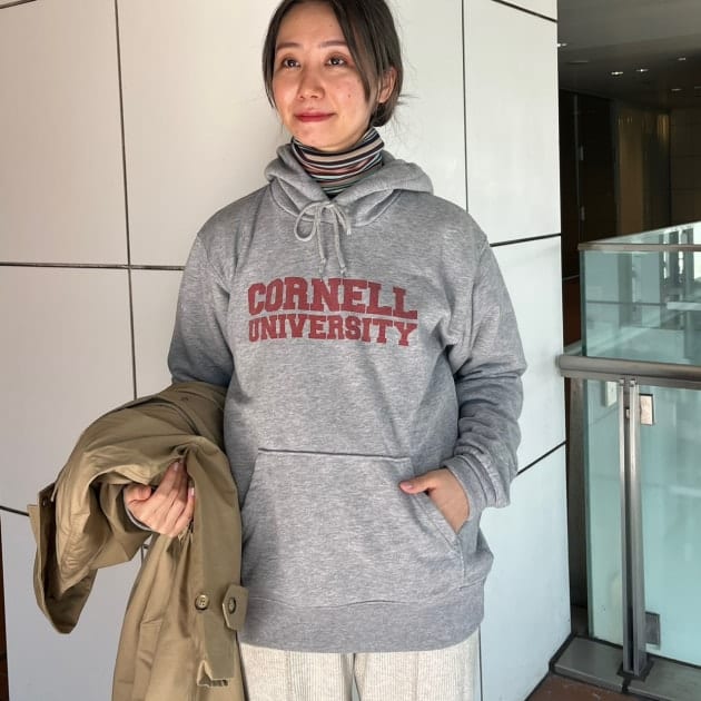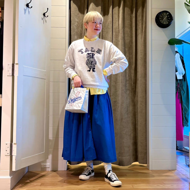 私は鮮やかなブルーにスウェットを合わせ、差し色でイエローを入れてみました!最近暖かくなってきたので、春らしい爽やかなコーディネートを組んでみました♪スカートはギャザーがたっぷりですが、重くなく、程よいボリューム感です!TM & ®️ Yale University